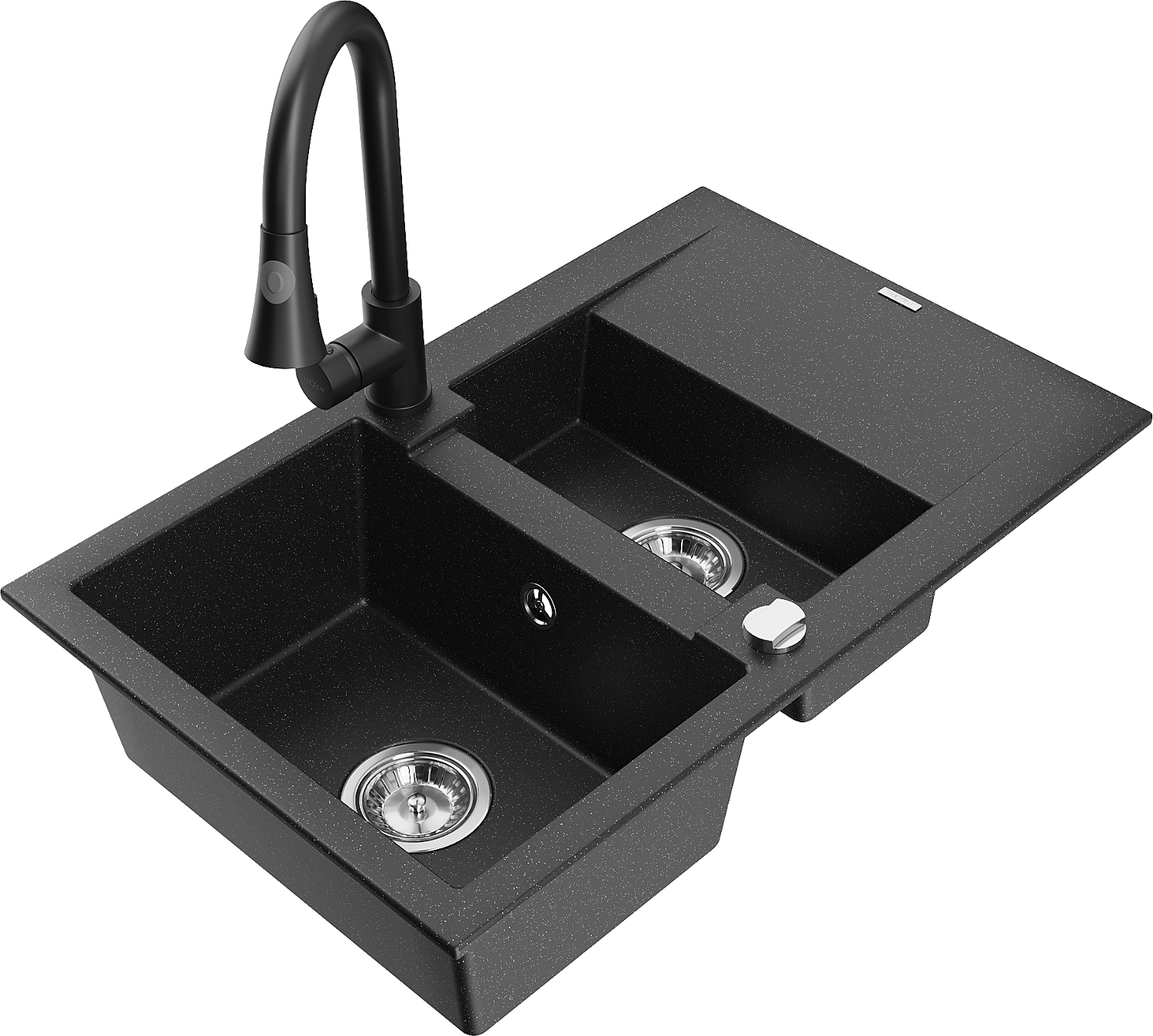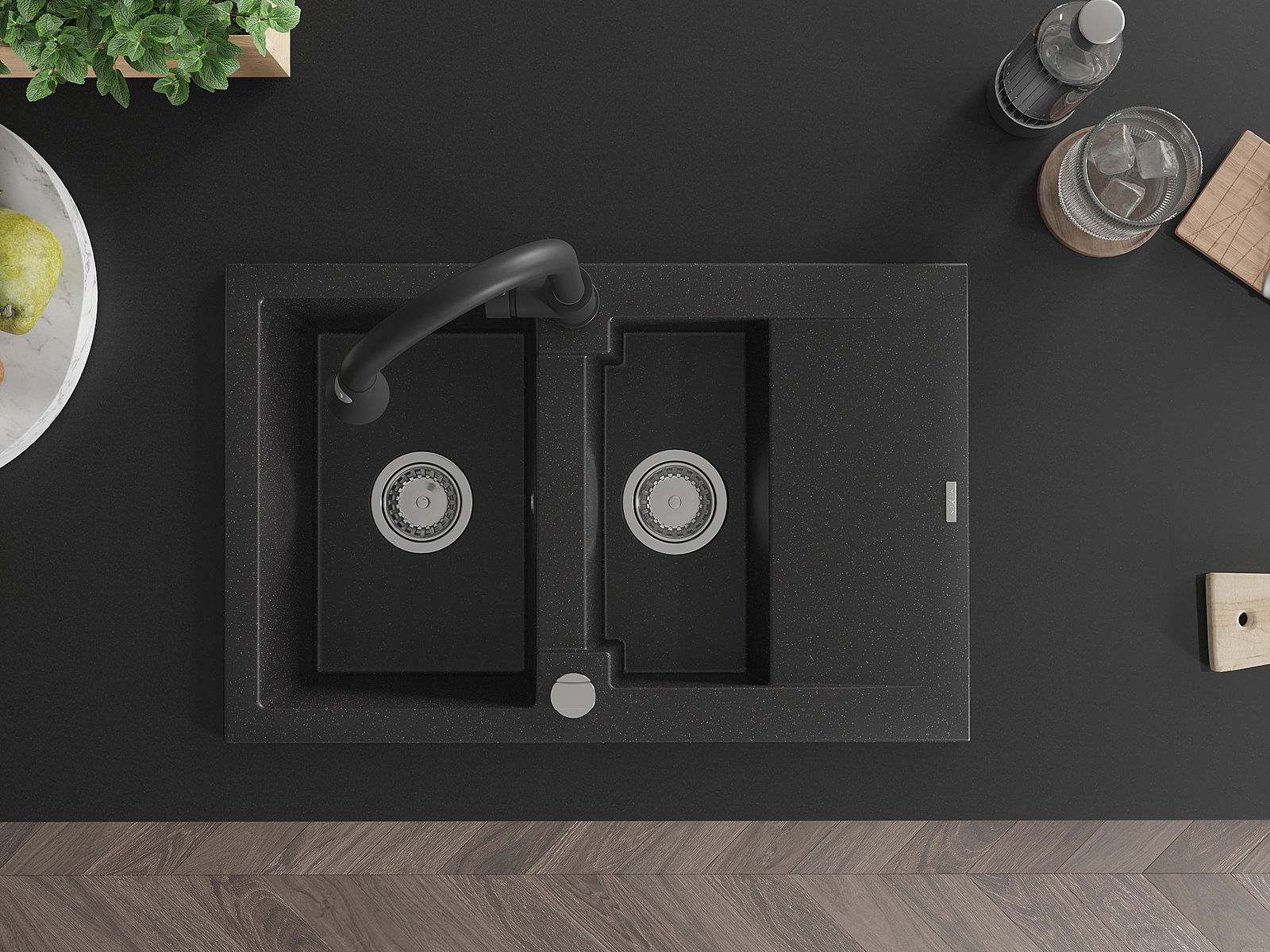 Mexen Gaspar granitizlietne izlietne ar 1,5 nodalījumu, notecinātāju un virtuves jaucējkrānu Elia, melns/sudraba metāliks