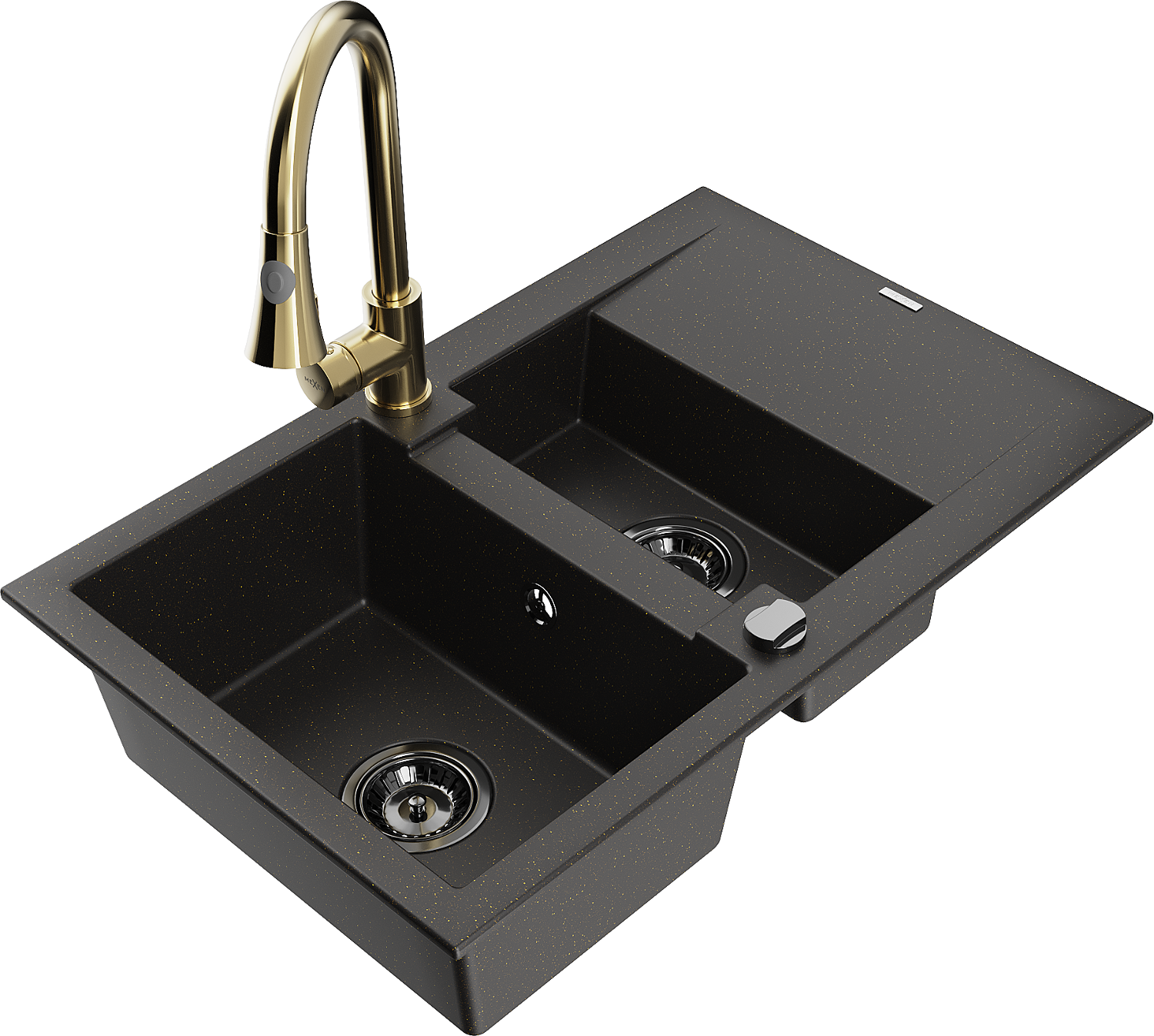 Mexen Gaspar Granitais izlietne ar 1,5 nodalījumu, notekas un virtuves krāns Elia, melns/zeltains metāliks - 6507-75-670101-50-B