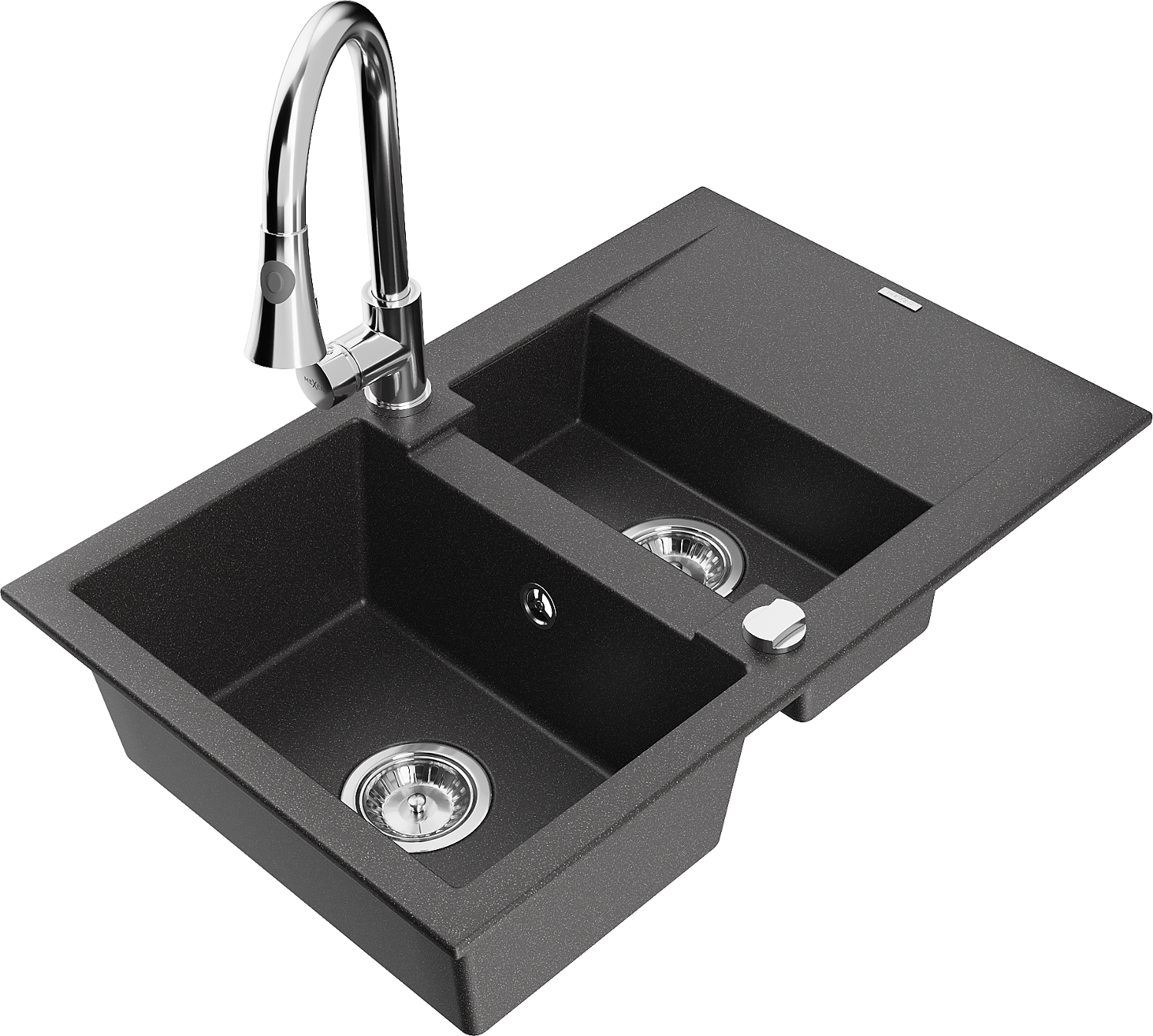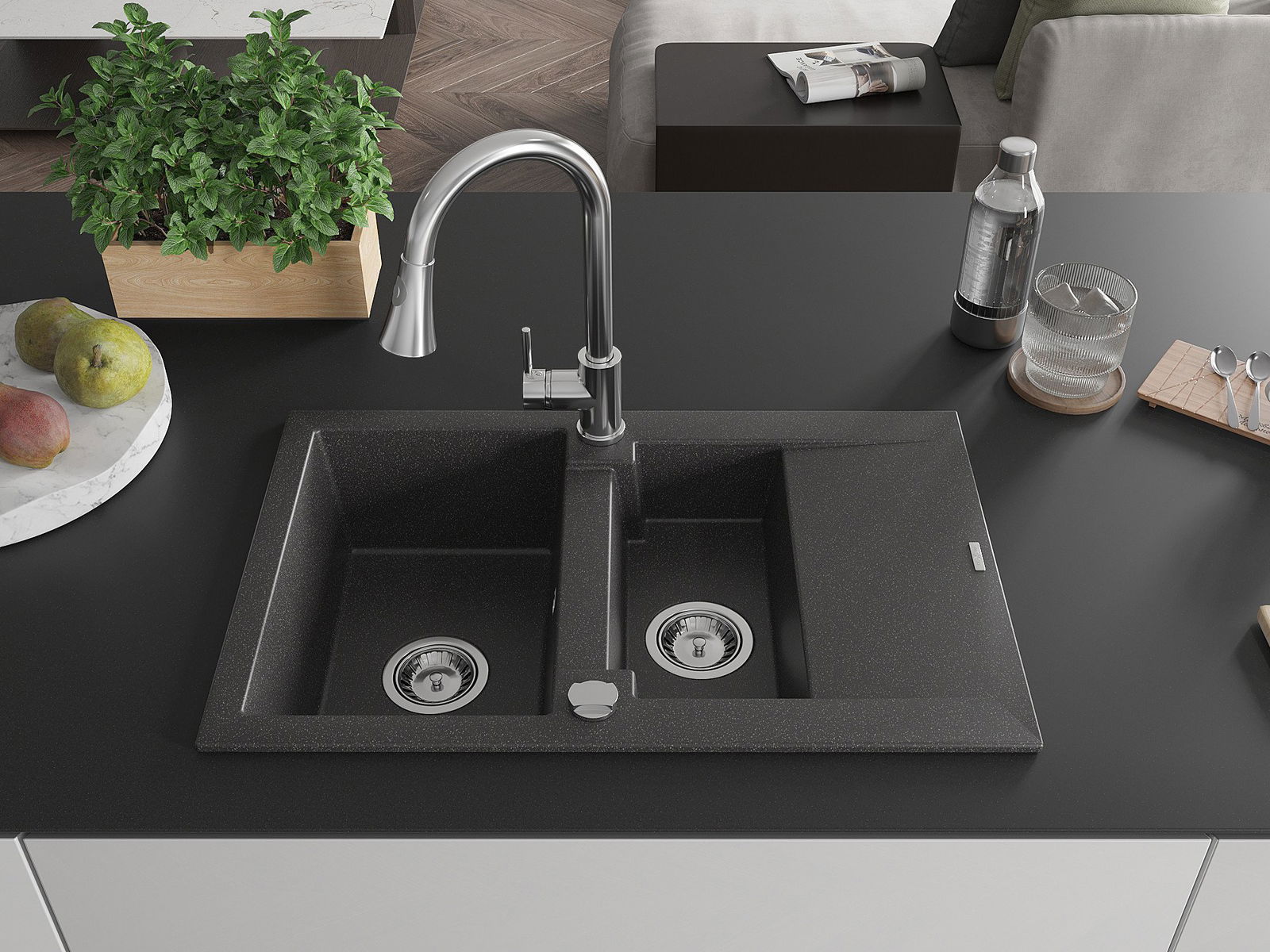 Mexen Gaspar 1,5 nodalīts granīta izlietne ar noteces zonu un Elia virtuves jaucējkrānu, melnā krāsā ar punktiem