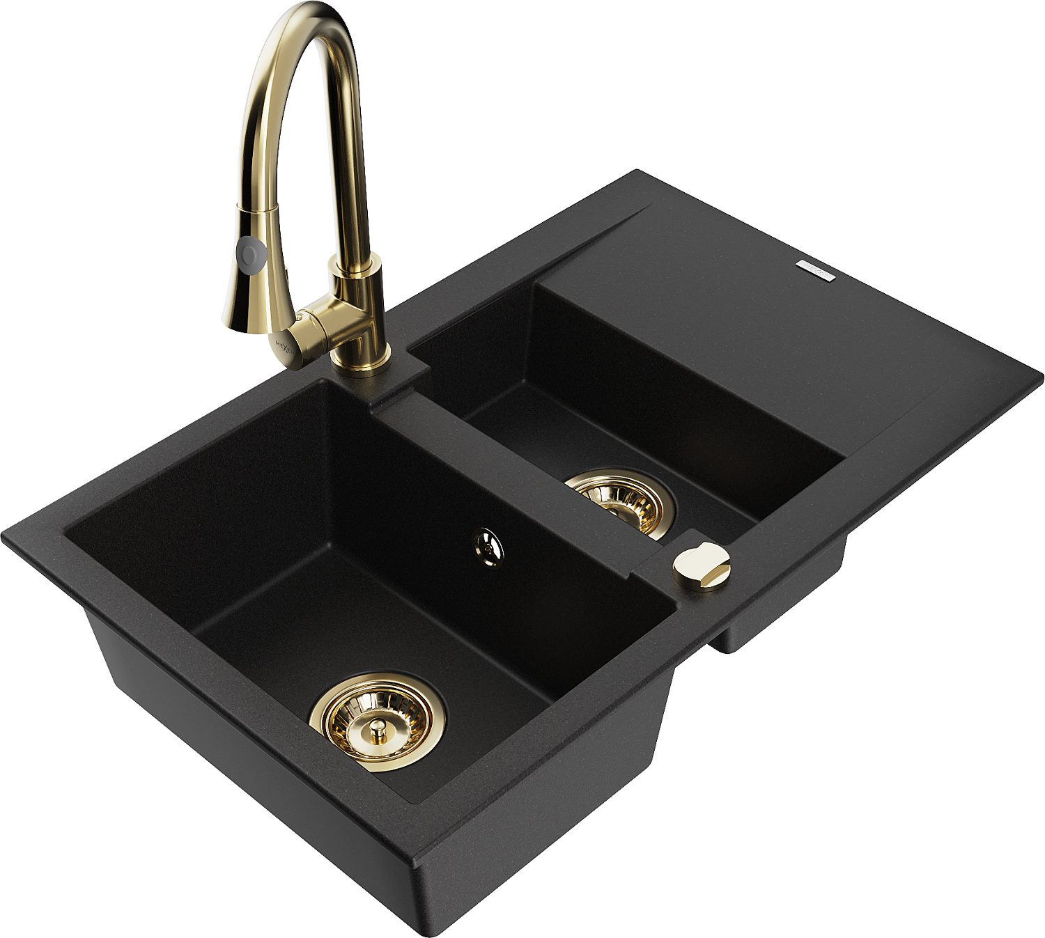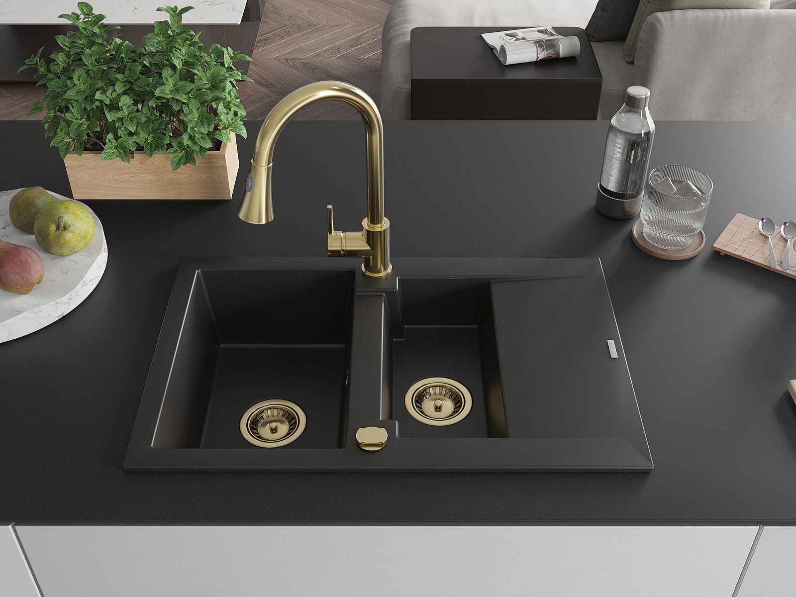 Mexen Gaspar granit izlietne ar 1,5 kameru un noteces reni un virtuves jaucējkrānu Elia, melna - 6507-77-670101-50
