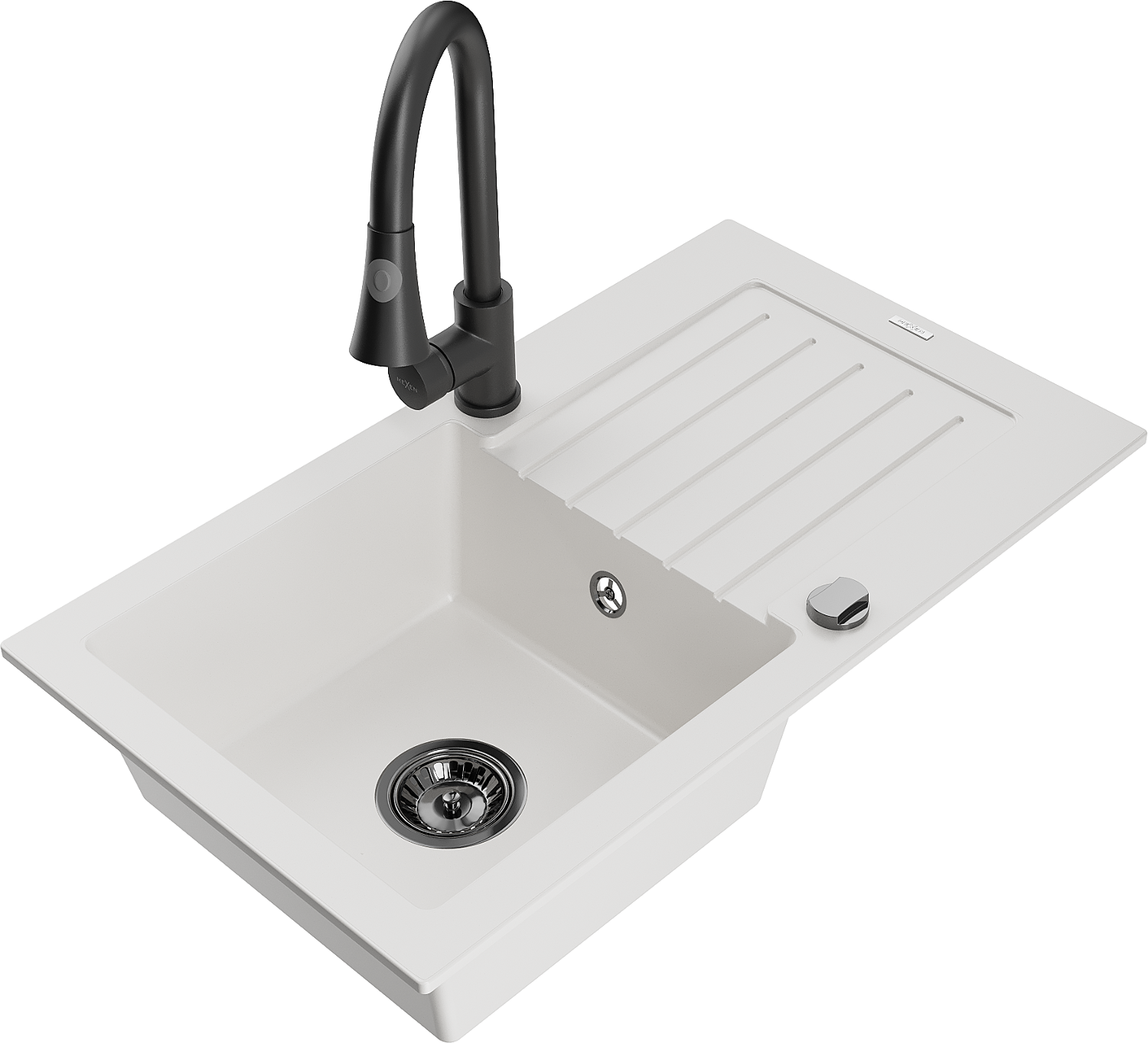Mexen Pablo granit izlietne ar vienu nodalījumu ar noteces zonu un virtuves jaucējkrānu Elia, balta - 6510-20-670101-70
