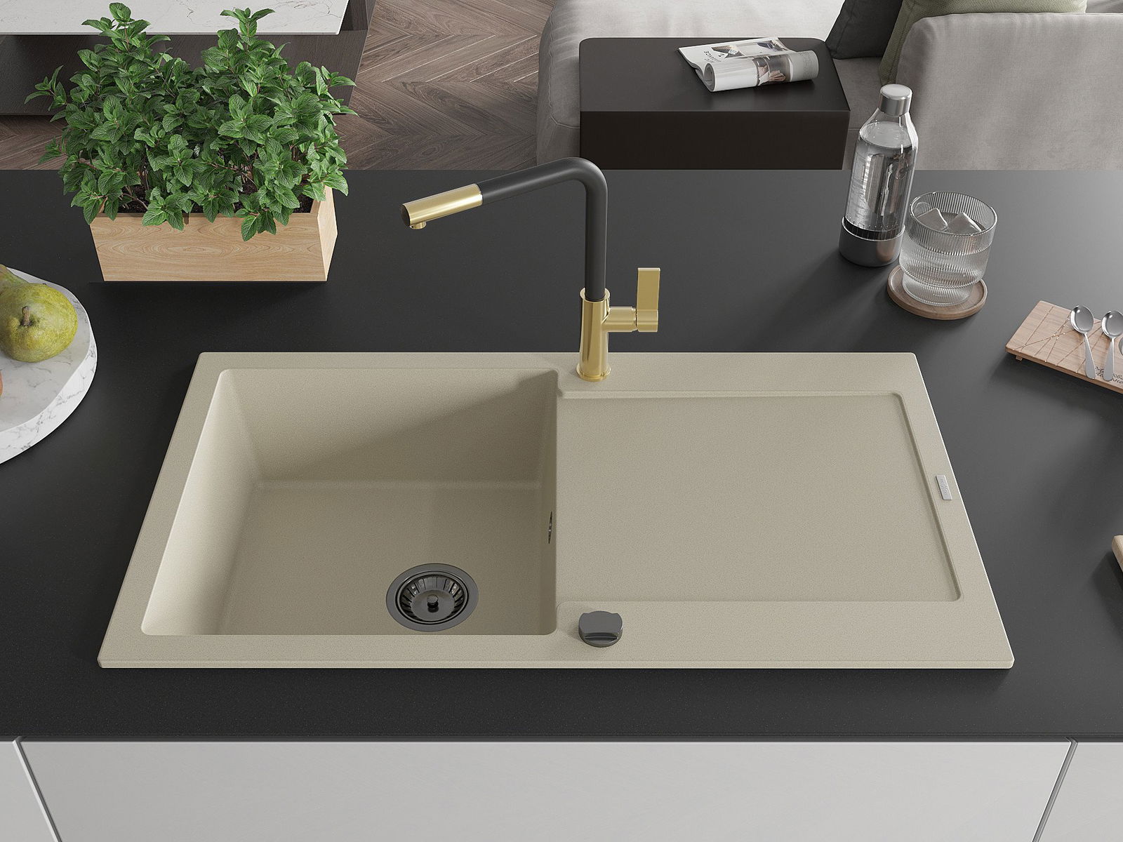 Mexen Leo granit izlietne ar 1 kameru un notekas, ar virtuves jaucējkrānu Flora, bēša - 6501-69-670401-57-B