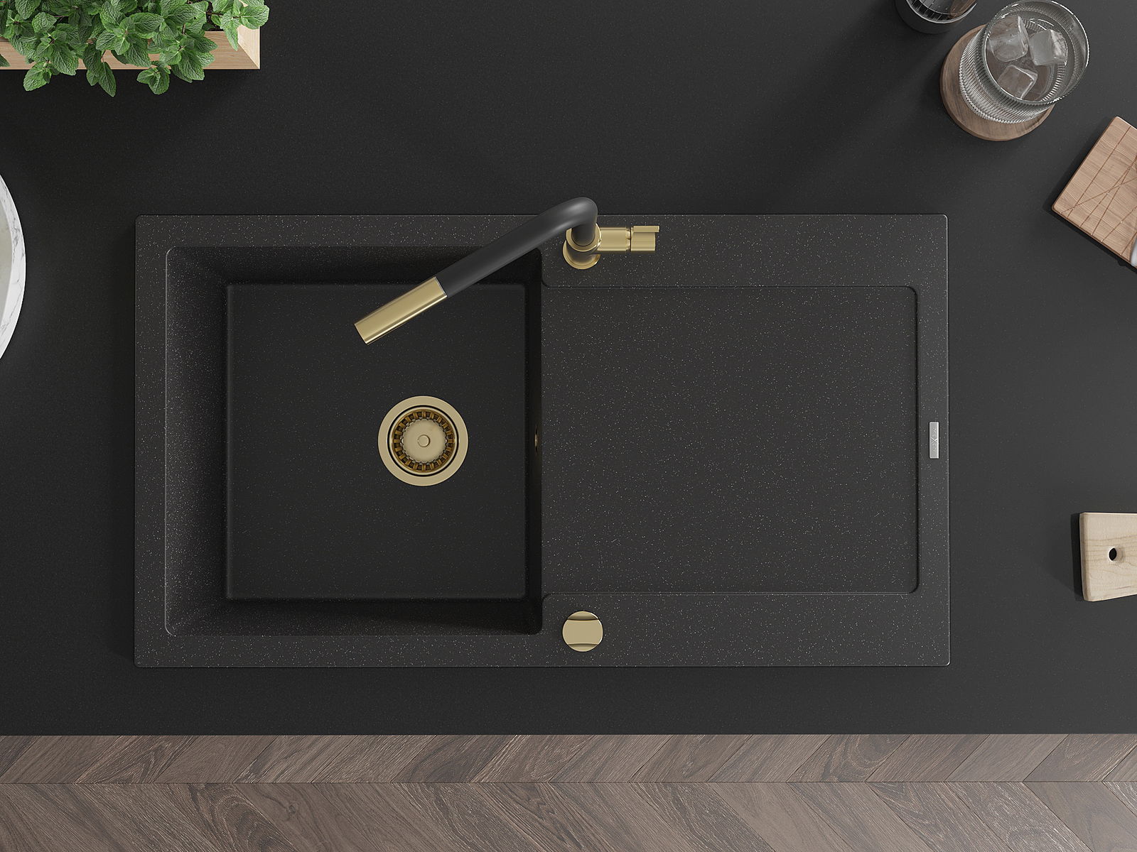 Izlietnei ir 2 daļēji izurbtas atveres ar diametru 35 mm, kuras var pašrocīgi izsist. Tās var izmantot, piemēram, šķidruma dozatora uzstādīšanai, kas novērsīs plastmasas pudeļu klātbūtni virtuvē un piešķirs tai elegantu apdari.