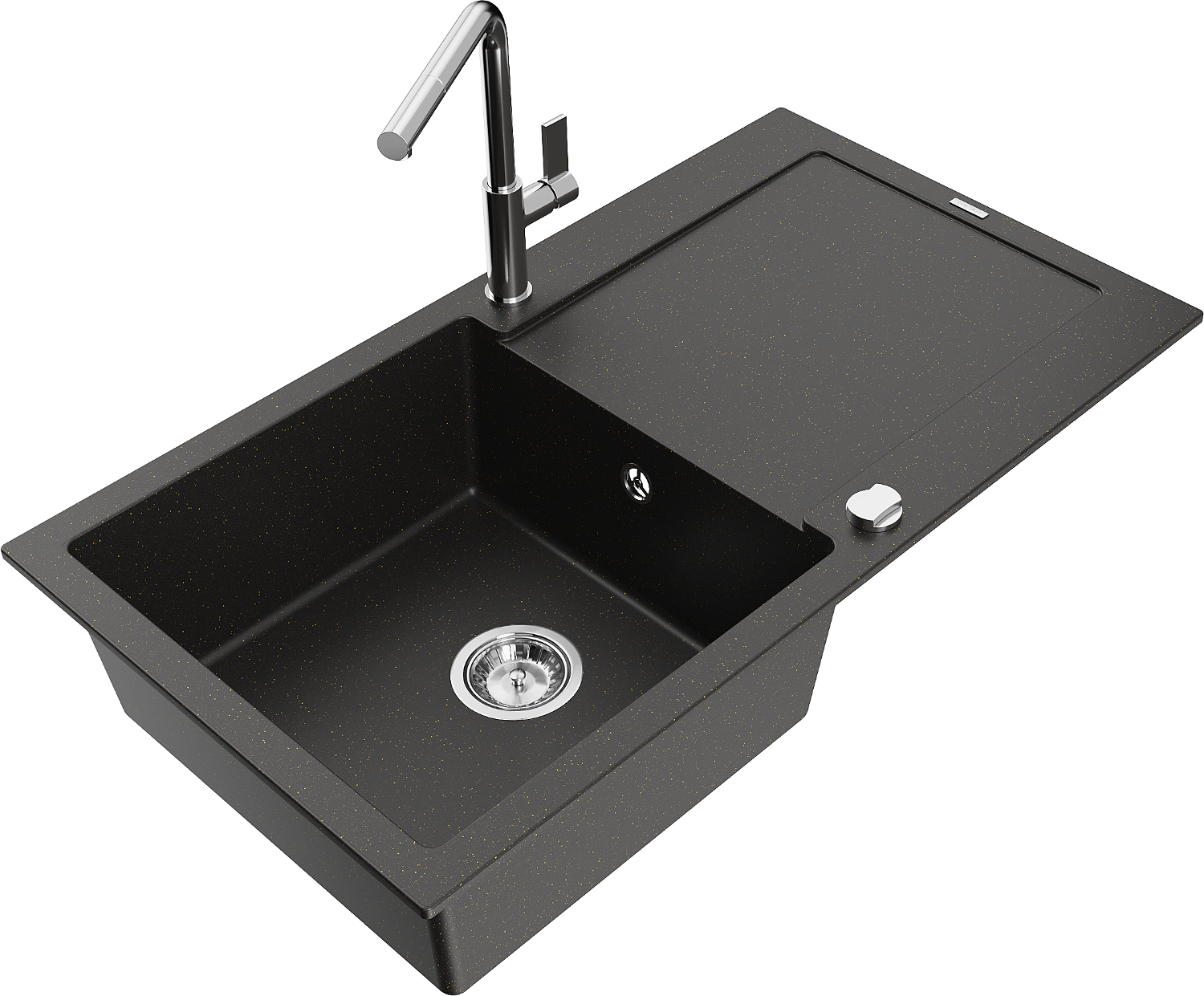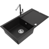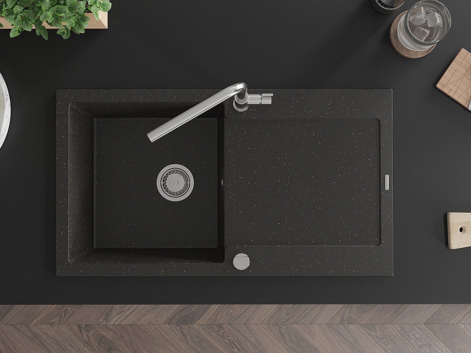 Mexen Leo granitizlietne 1-kameras ar notekplauktu un virtuvju maisītāju Flora, melns/zelta metālika - 6501-75-670401-00