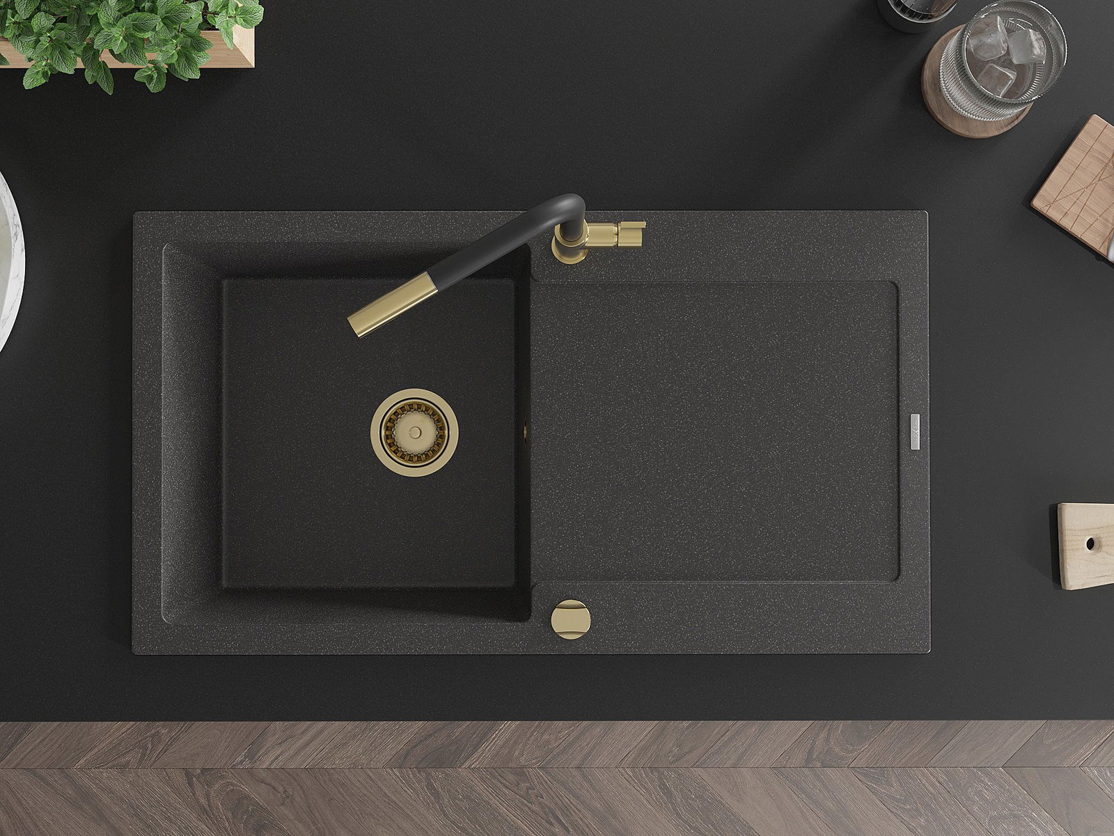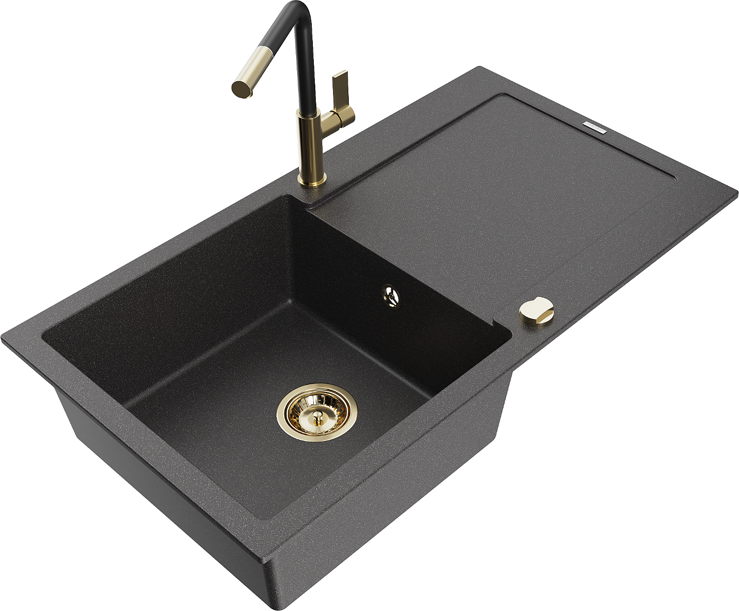 Mexen Leo granitizlietne vienas kameras izlietne ar noteces paneli un virtuves jaucējkrānu Flora, melns ar melniem plankumiem