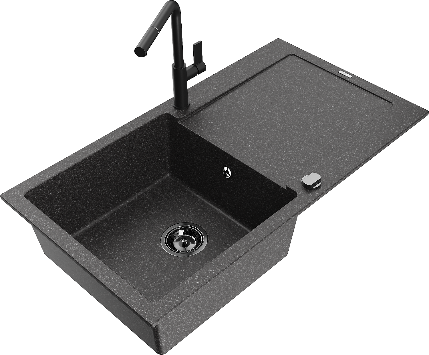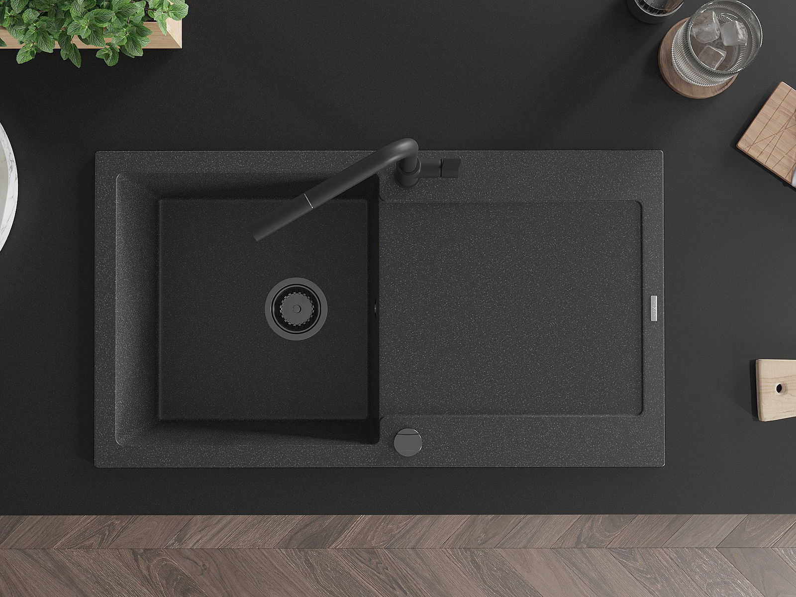 Mexen Leo vienas bļodas granīta izlietne ar noteku un virtuves jaucējkrānu Flora, melns ar plankumiem - 6501-76-670401-70-B