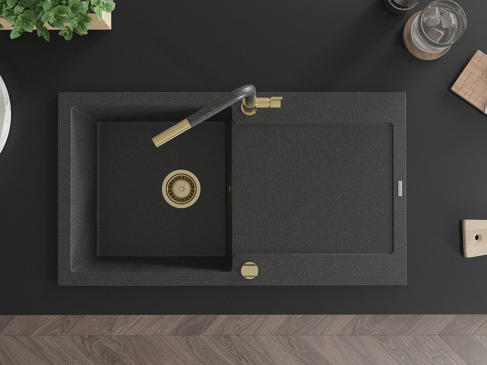 Mexen Leo granitauta izlietne ar vienu nodalījumu, notekplātni un virtuves jaucējkrānu Flora, melni raibi - 6501-76-670401-75-G