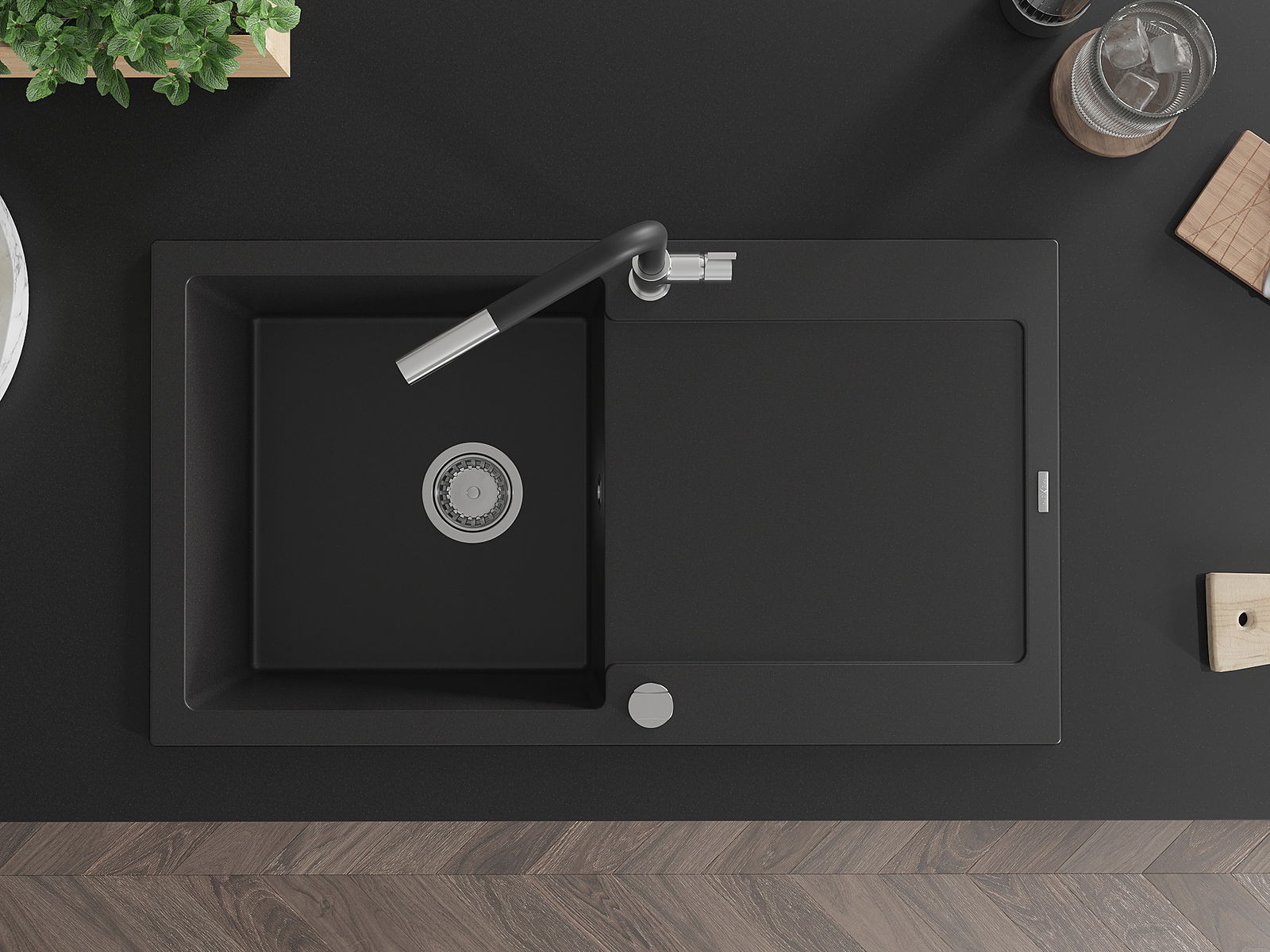Mexen Leo granitizlietne ar 1 nodalījumu, notecinātāju un virtuves jaucējkrānu Flora, melns - 6501-77-670401-07