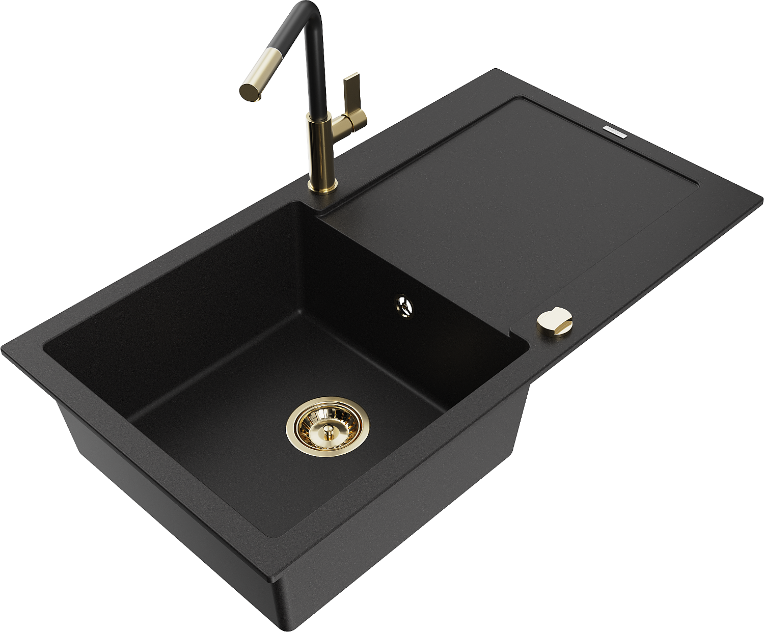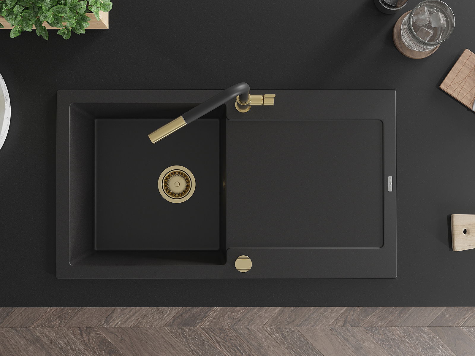 Mexen Leo granit izlietne ar vienu nodalījumu, ūdensizturīgu darba virsmu un virtuves krānu Flora, melna - 6501-77-670401-57-G