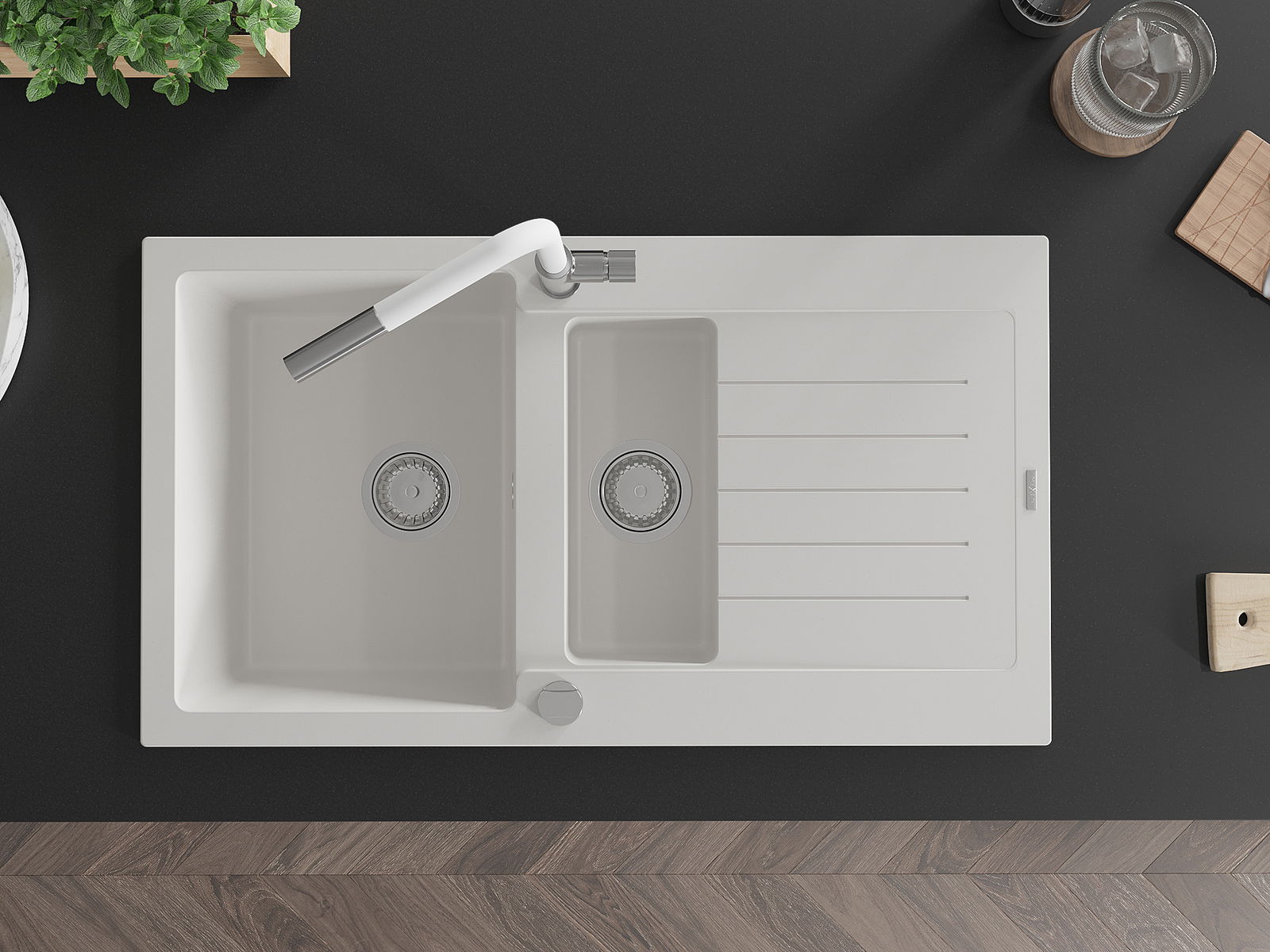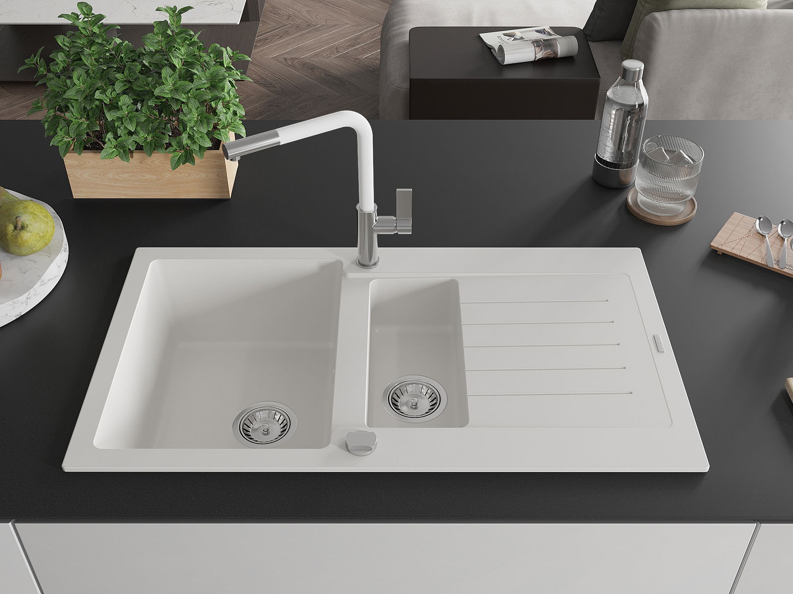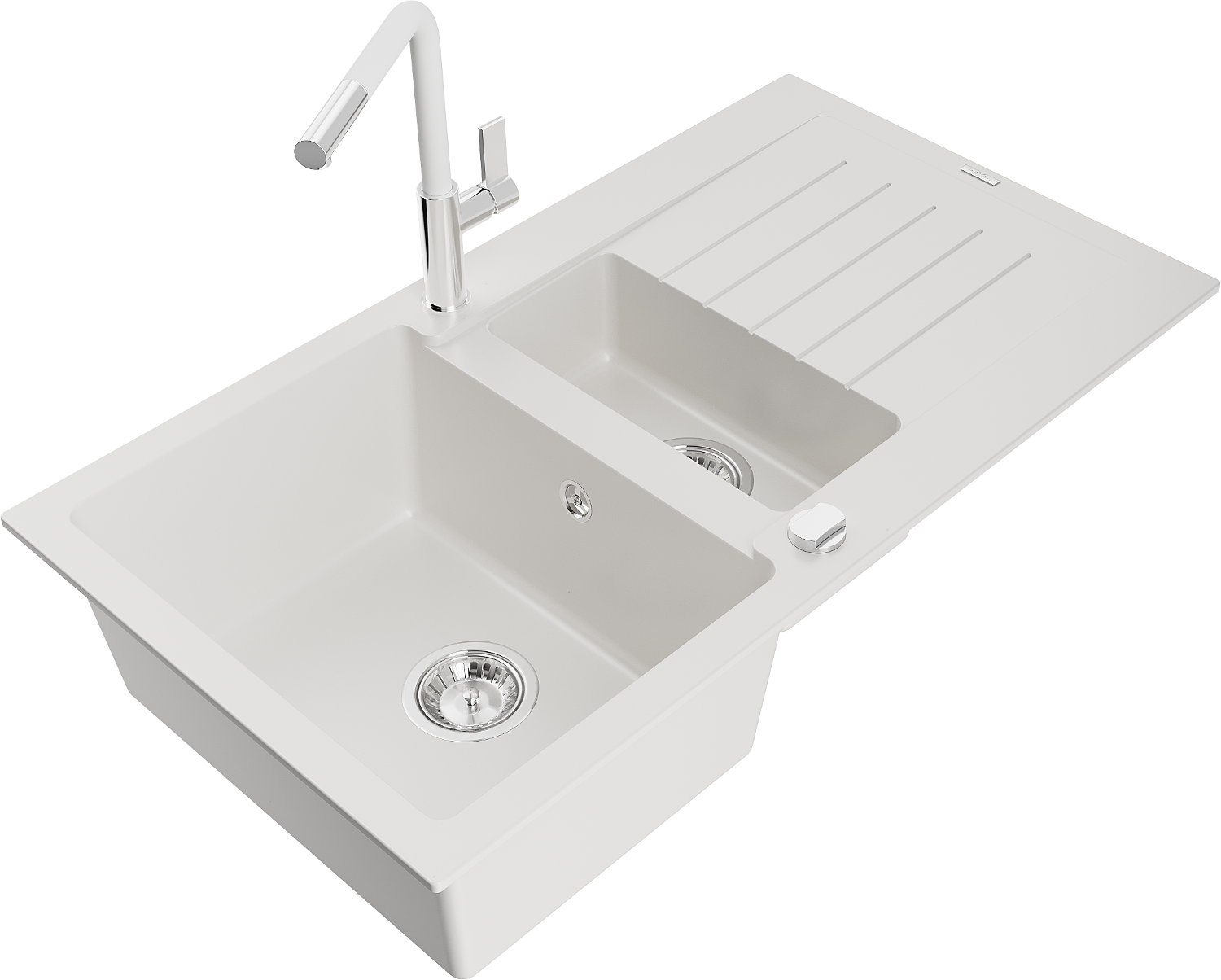 Mexen Matias granīta izlietne ar 1,5 nodalījumiem, žāvēšanas virsmu un Flora virtuves jaucējkrānu, balta - 6502-20-670401-02