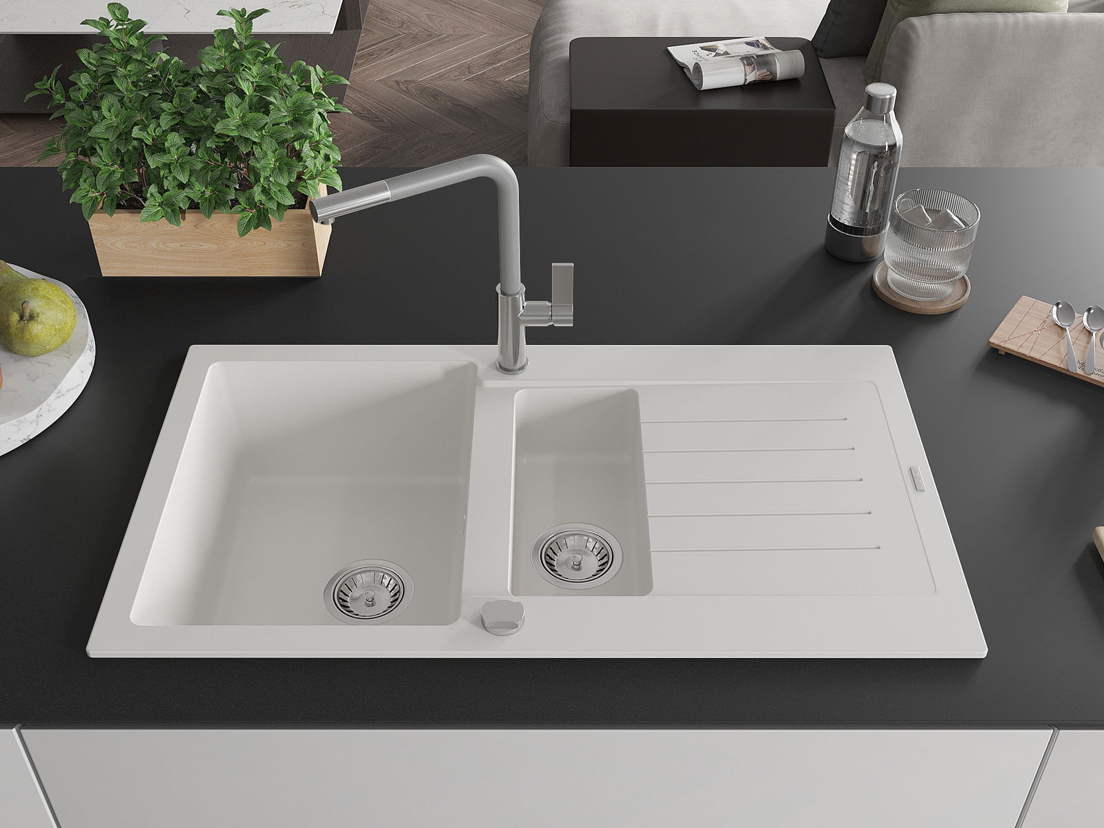 Mexen Matias granitā izlietne ar 1,5 kamerām un nosūcēju un virtuves jaucējkrānu Flora, balta - 6502-20-670401-06