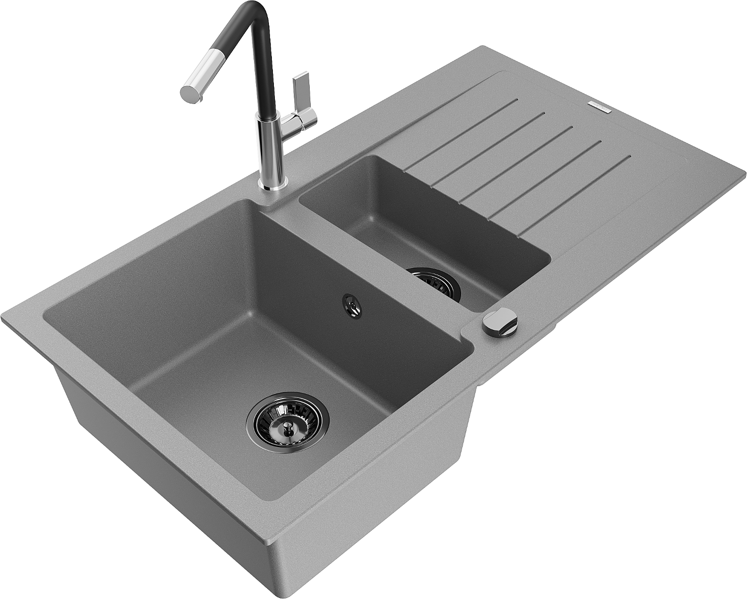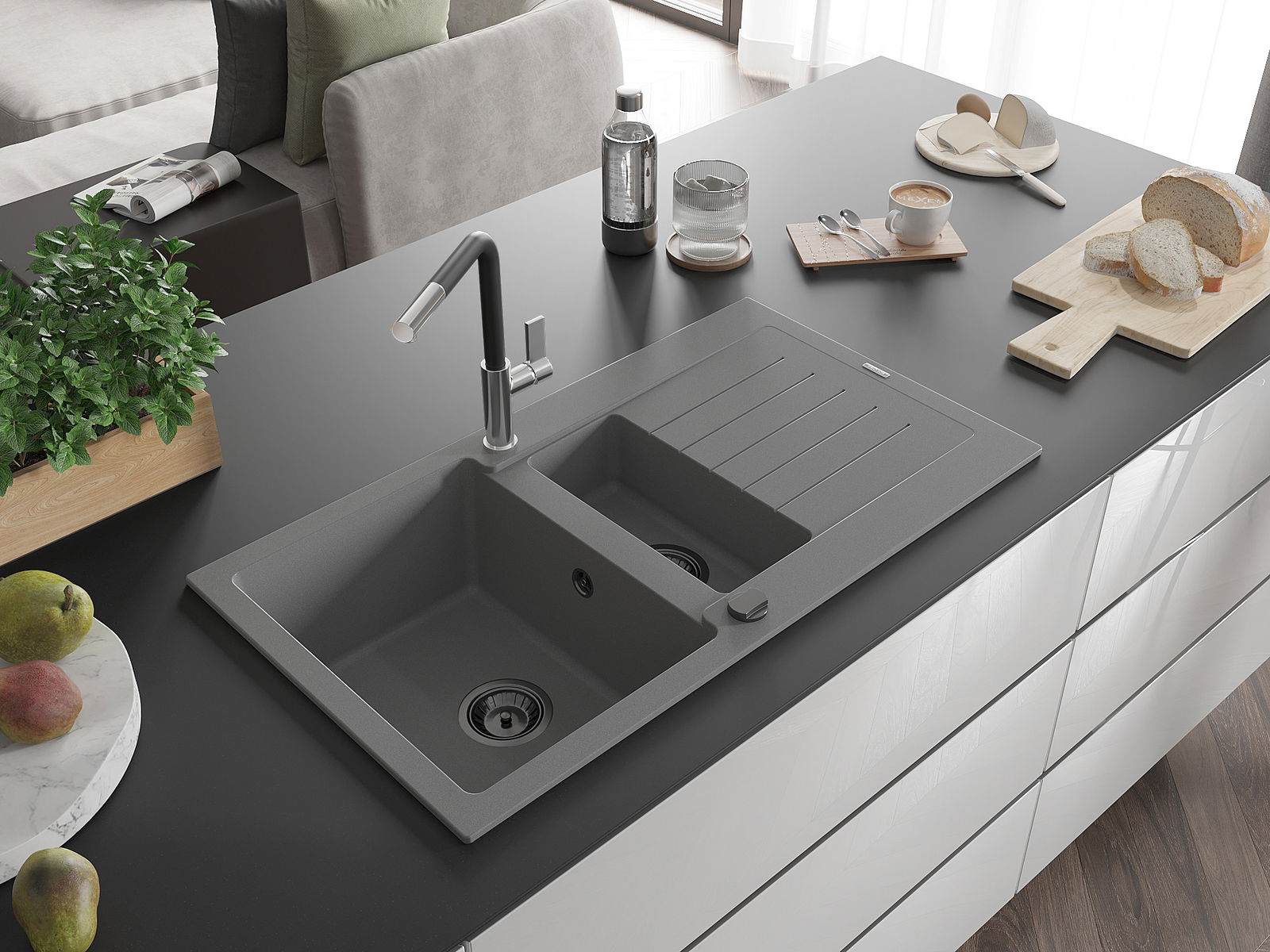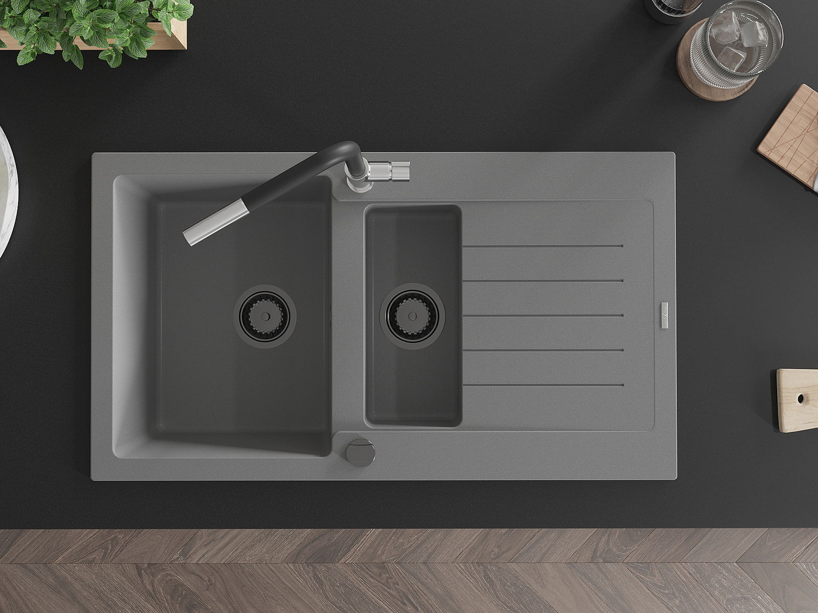 Mexen Matias granitē izlietne 1,5 nodalījumu ar notekplati un virtuves jaucējkrānu Flora, pelēka - 6502-71-670401-07-B