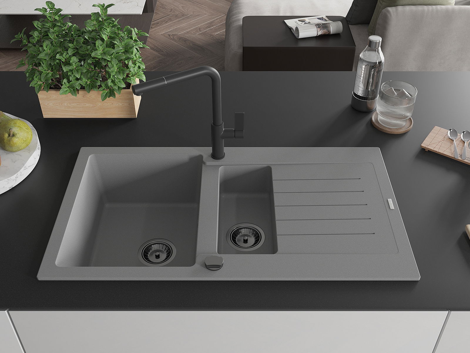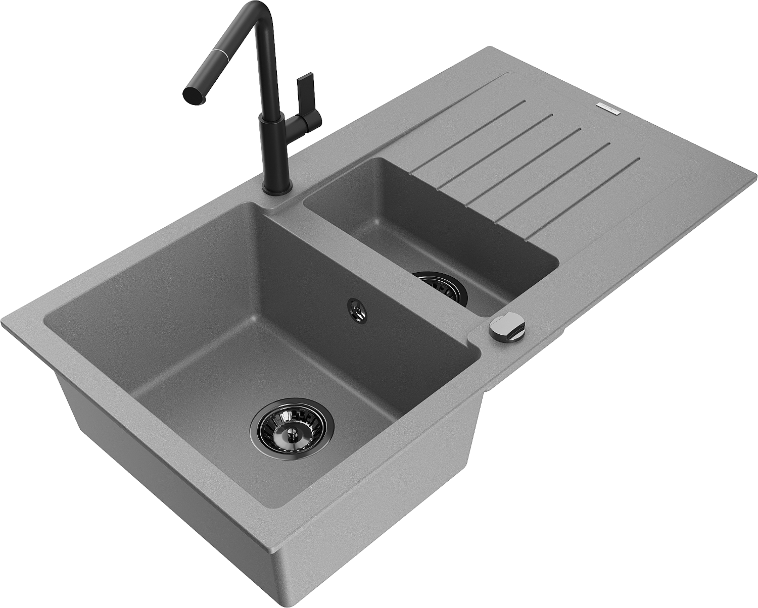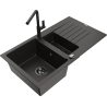Mexen Matias granitēta izlietne ar 1,5 kamerām, ar notekas un virtuves jaucējkrānu Flora, pelēka - 6502-71-670401-70-B