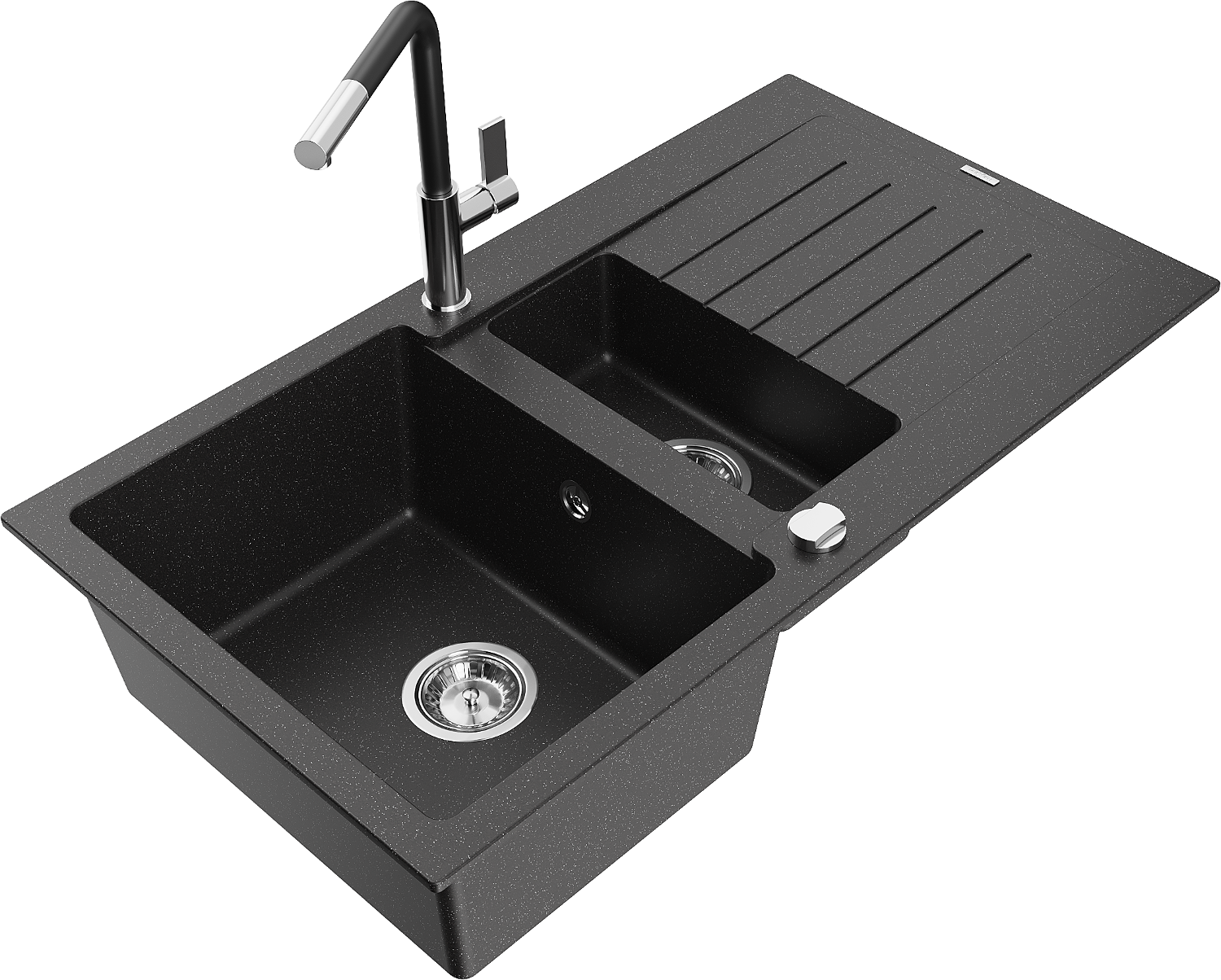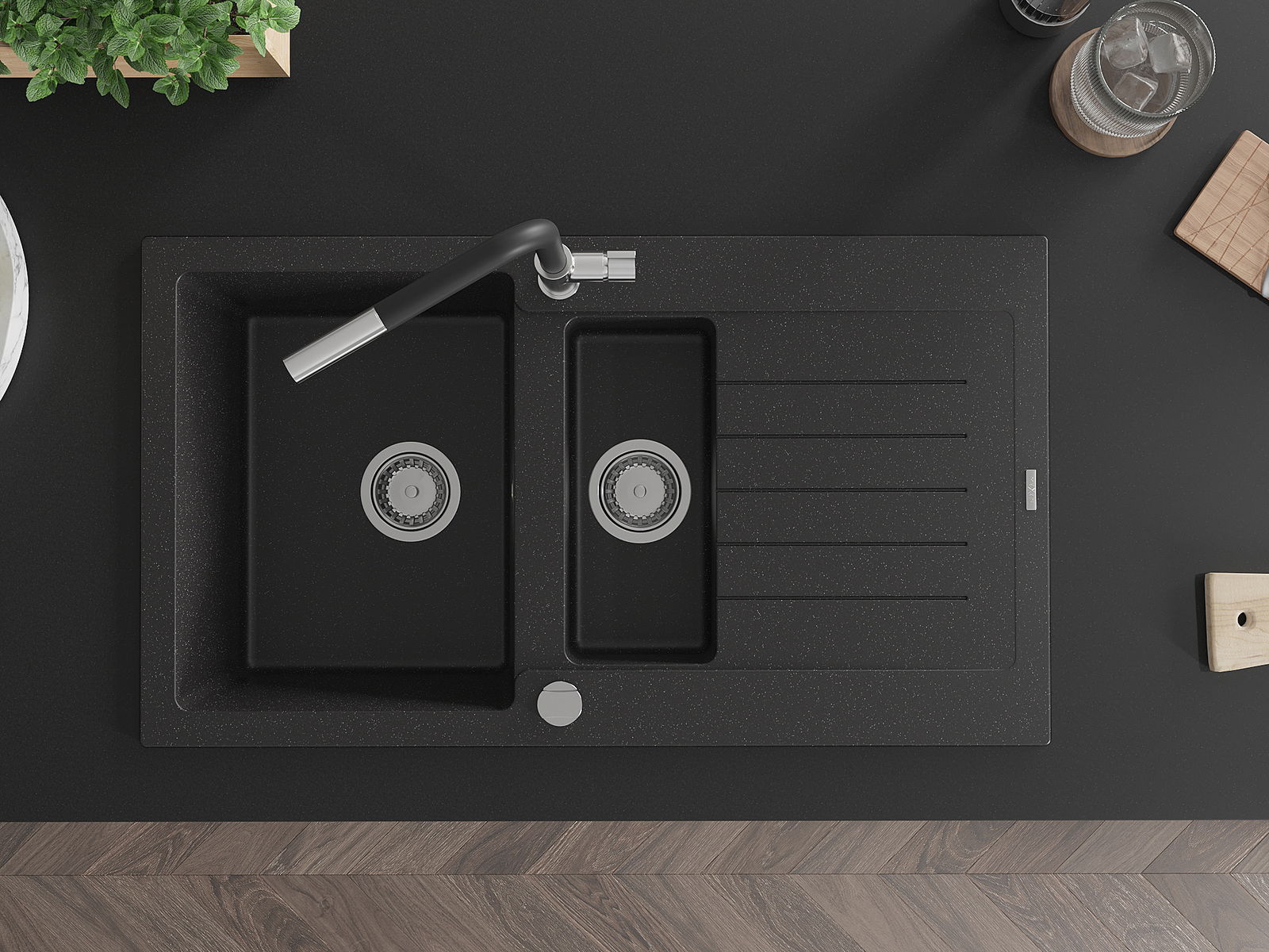 Mexen Matias granīta izlietne ar 1,5 nodalījumiem un notekas dēli, ar Flora virtuves krānu, melns/sudrabs - 6502-73-670401-07