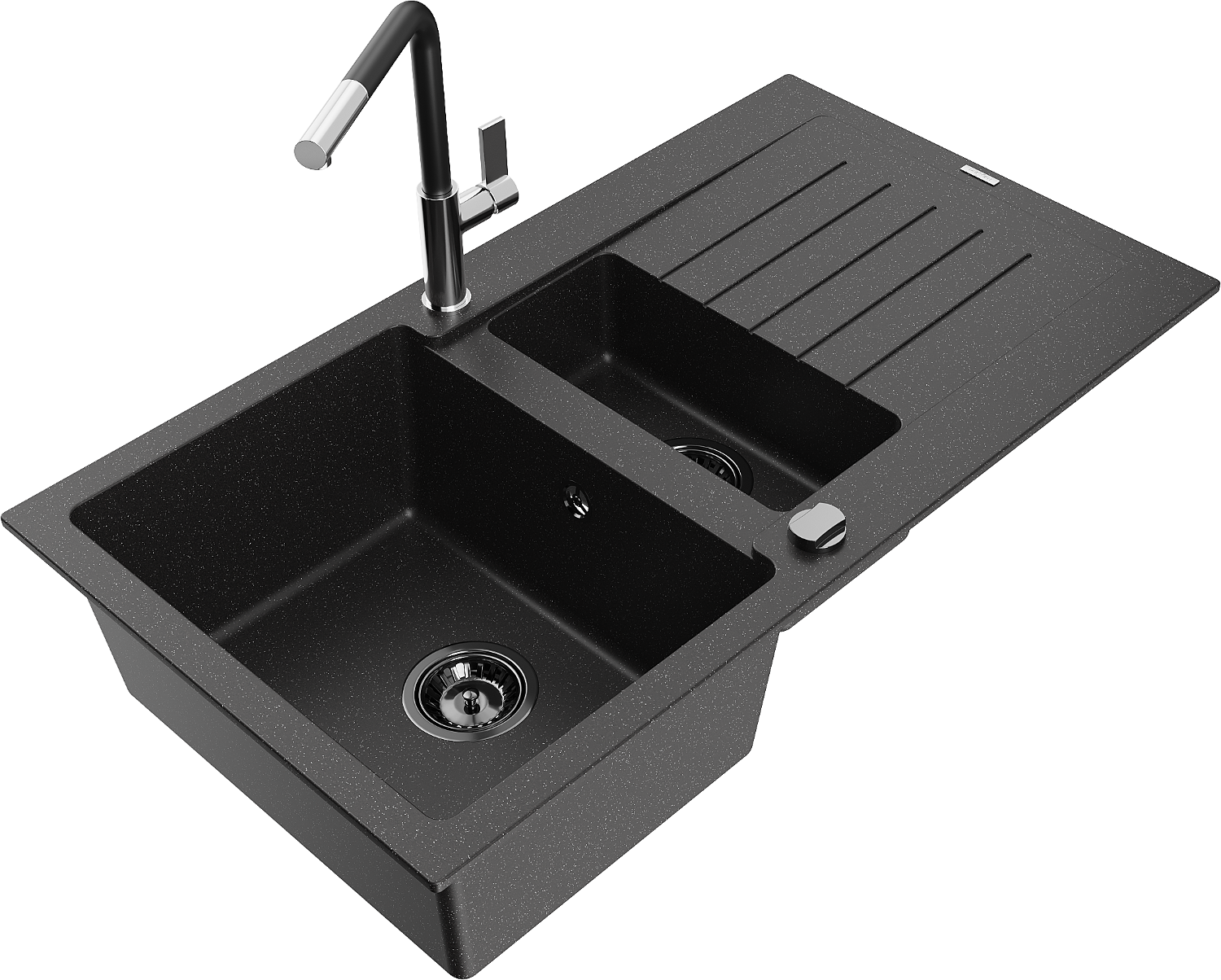 Mexen Matias granit izlietne 1,5 nodalījums ar izvadvirsmu un Flora virtuves jaucējkrānu, melns/sudrabs - 6502-73-670401-07-B