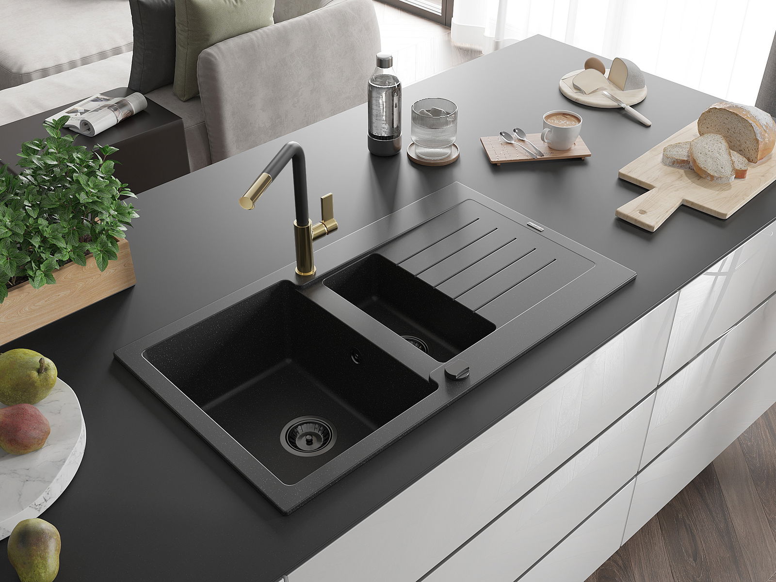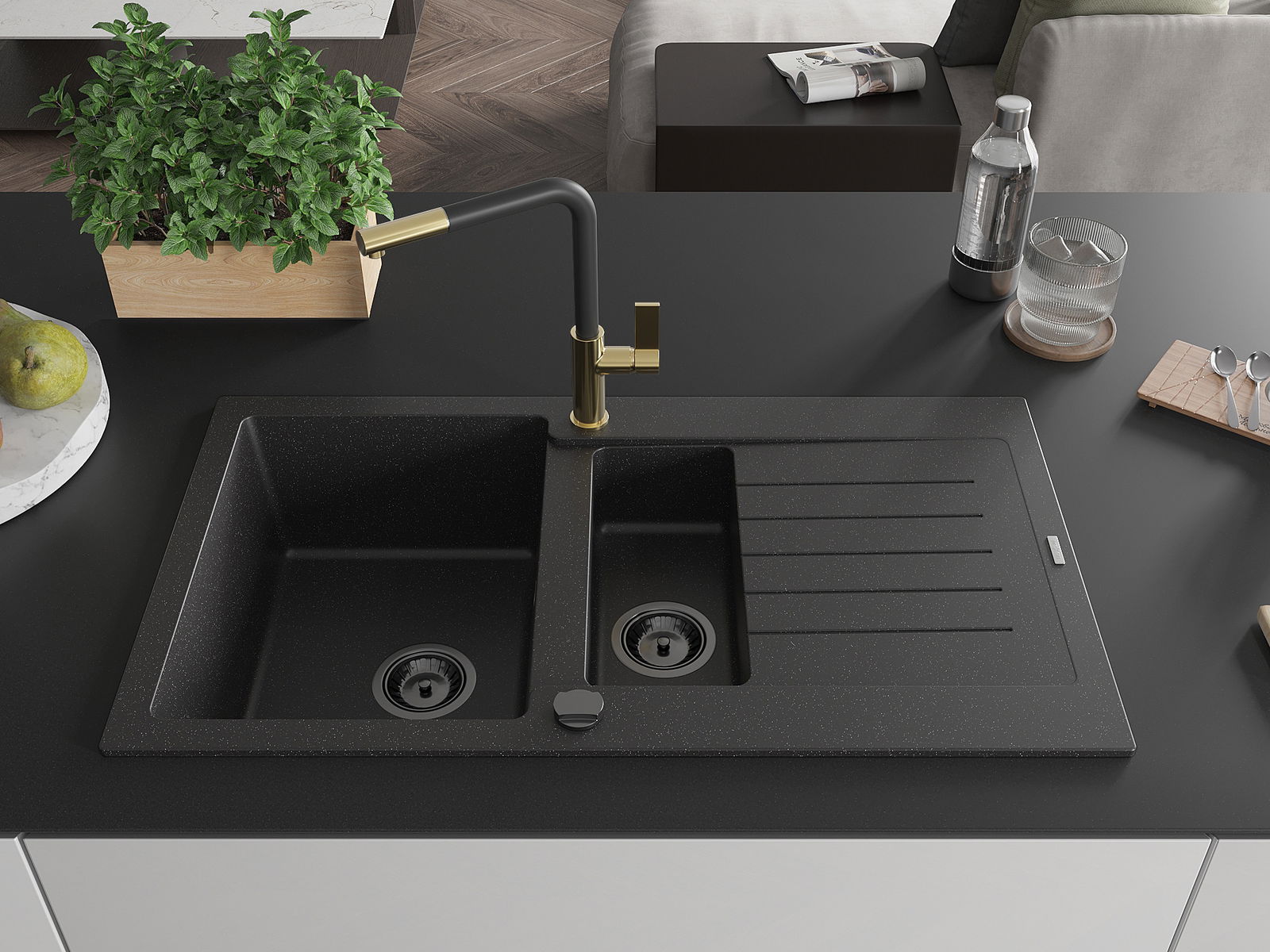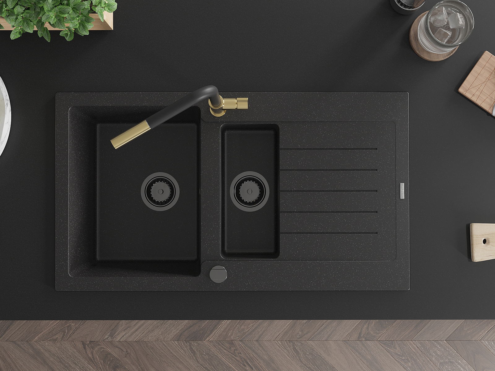 Izlietnei ir 2 daļēji izurbtas atveres ar diametru 35 mm, kuras var pašrocīgi izsist. Tās var izmantot, piemēram, šķidruma dozatora uzstādīšanai, kas novērsīs plastmasas pudeļu klātbūtni virtuvē un piešķirs tai elegantu apdari.