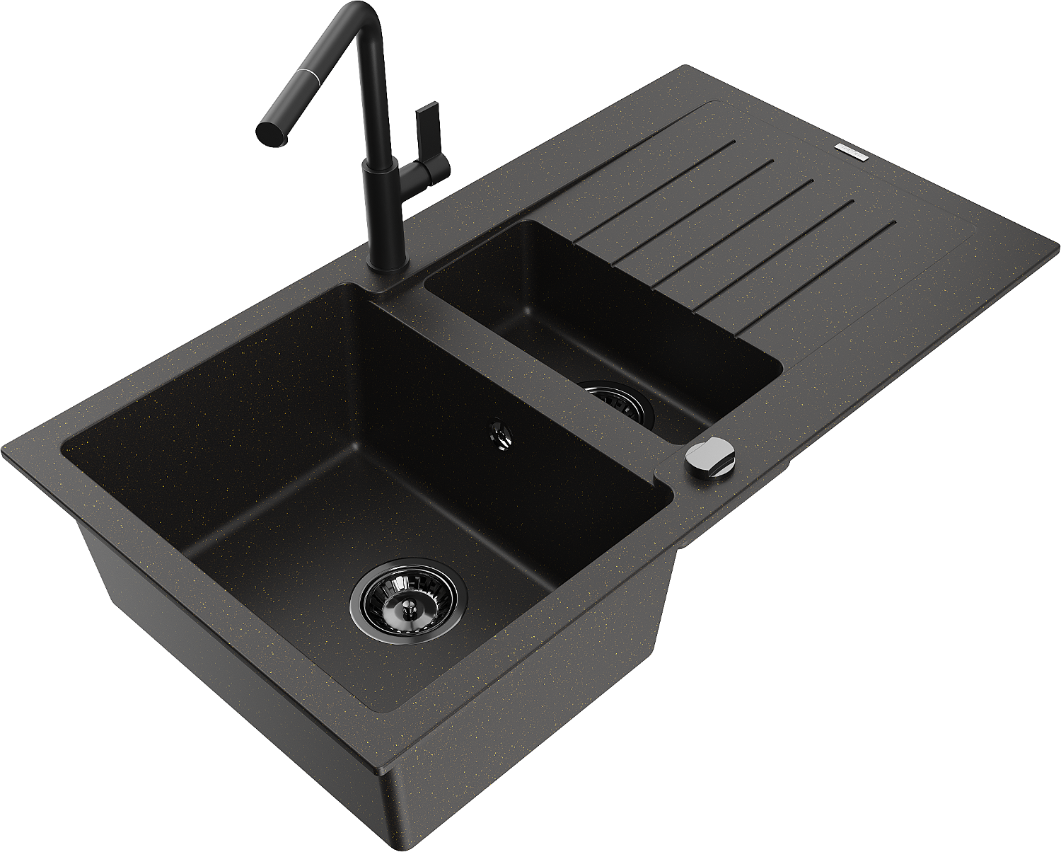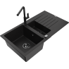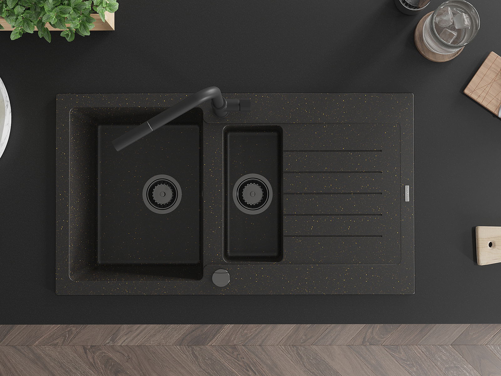 Mexen Matias granīta izlietne 1,5 nodalījumu ar notekas un virtuves jaucējkrānu Flora, melns/zeltains - 6502-75-670401-70-B