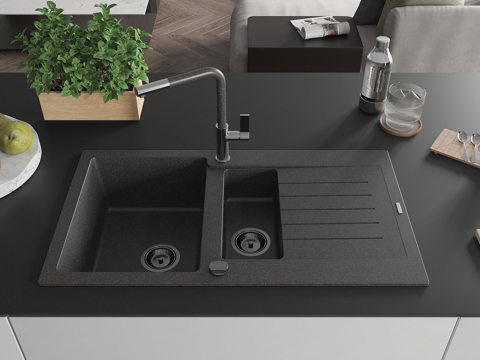 Mexen Matias granīta izlietne 1,5 starpsiena ar noteces daļu un virtuves krānu Flora, melna ar punktiem - 6502-76-670401-08-B