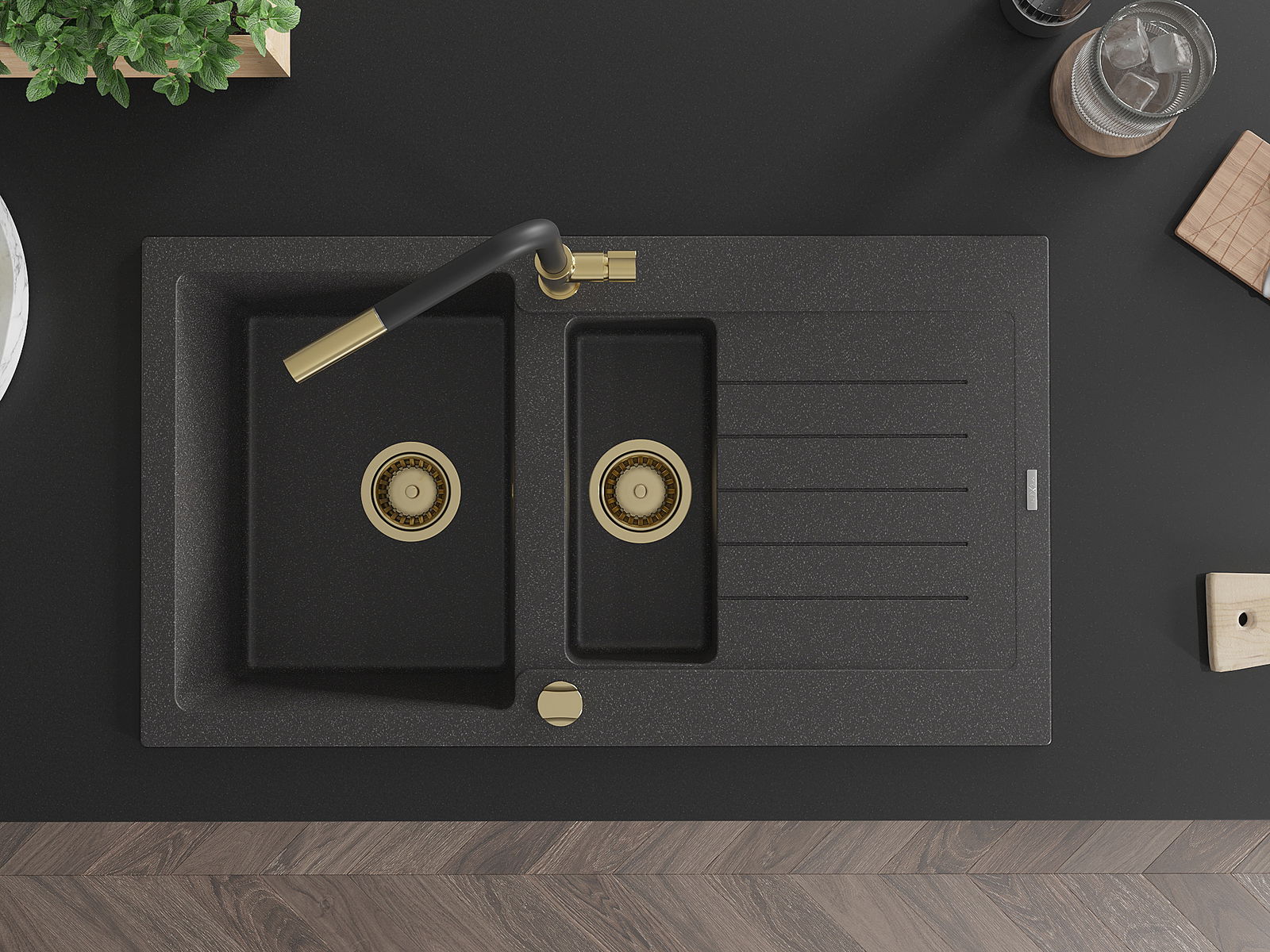 Mexen Matias granitizlietne 1,5 kameru izlietne ar notekas un Flora virtuves jaucējkrāns, melns ar plankumiem