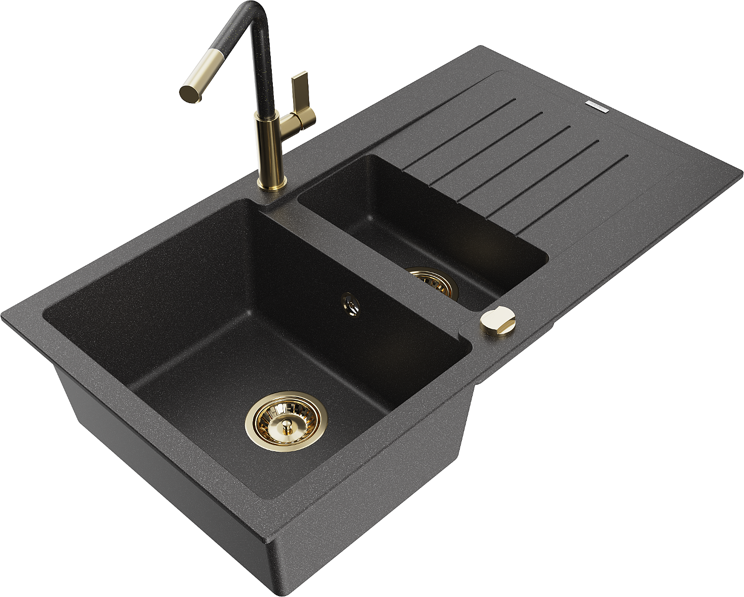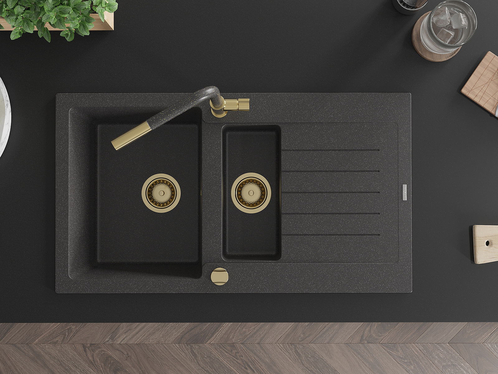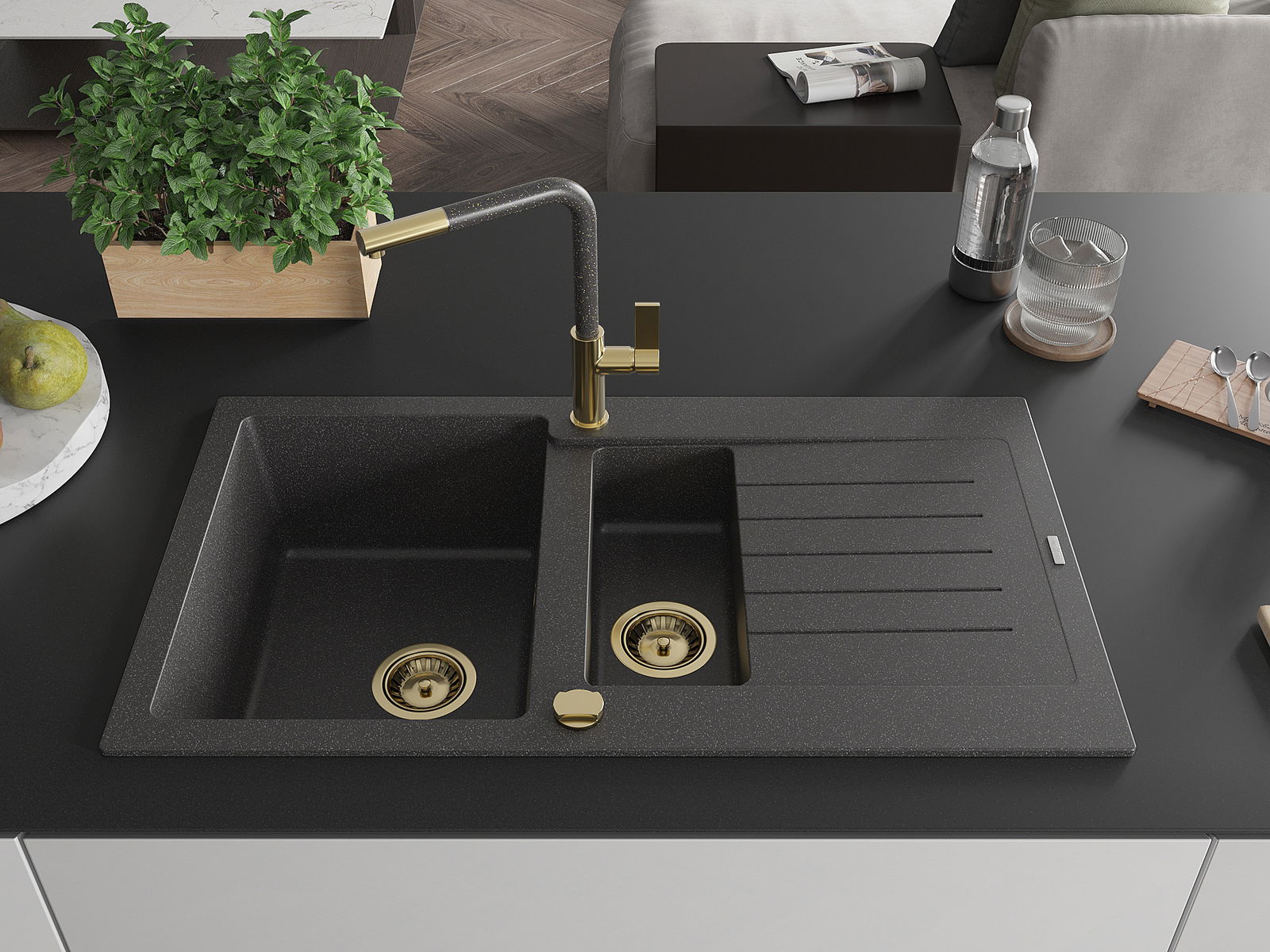 Mexen Matias granitizlietne 1,5 nodalījuma ar noteku un virtuves jaucējkrānu Flora, melns ar plankumiem - 6502-76-670401-75-G