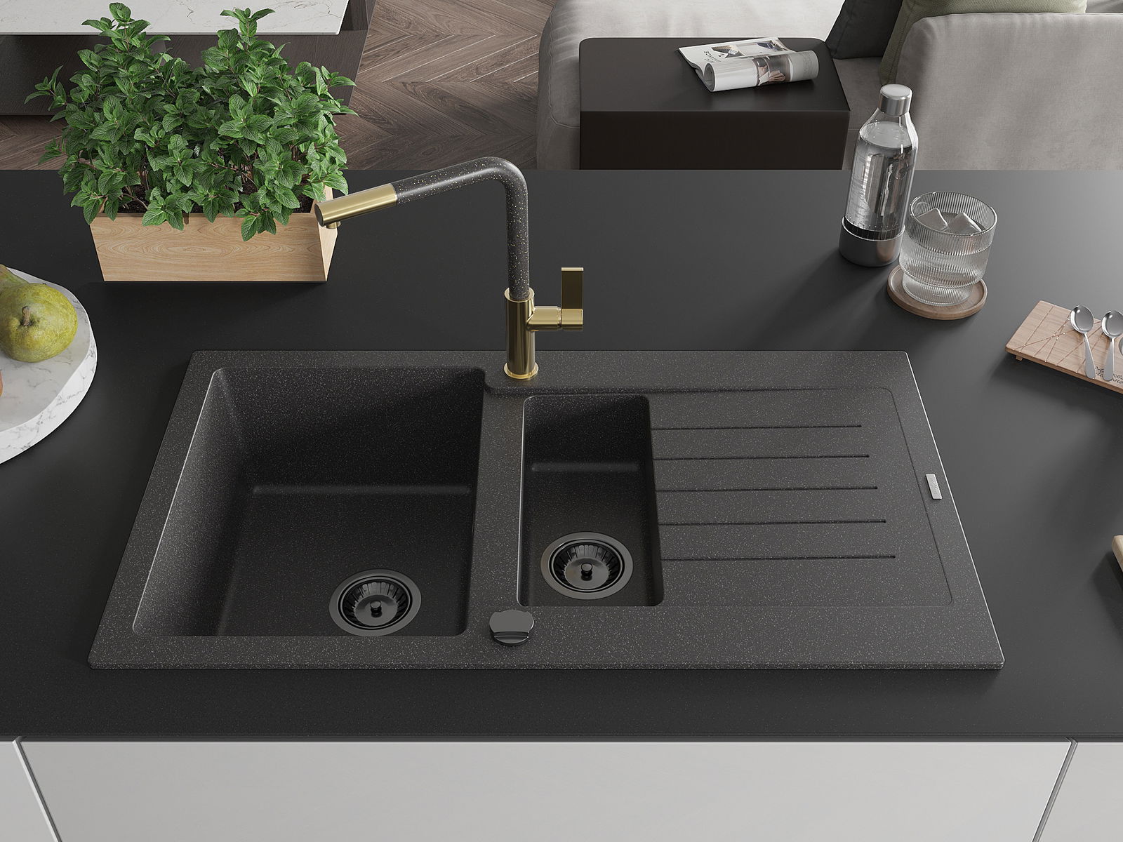 Izlietnei ir 2 daļēji izurbtas atveres ar diametru 35 mm, kuras var pašrocīgi izsist. Tās var izmantot, piemēram, šķidruma dozatora uzstādīšanai, kas novērsīs plastmasas pudeļu klātbūtni virtuvē un piešķirs tai elegantu apdari.