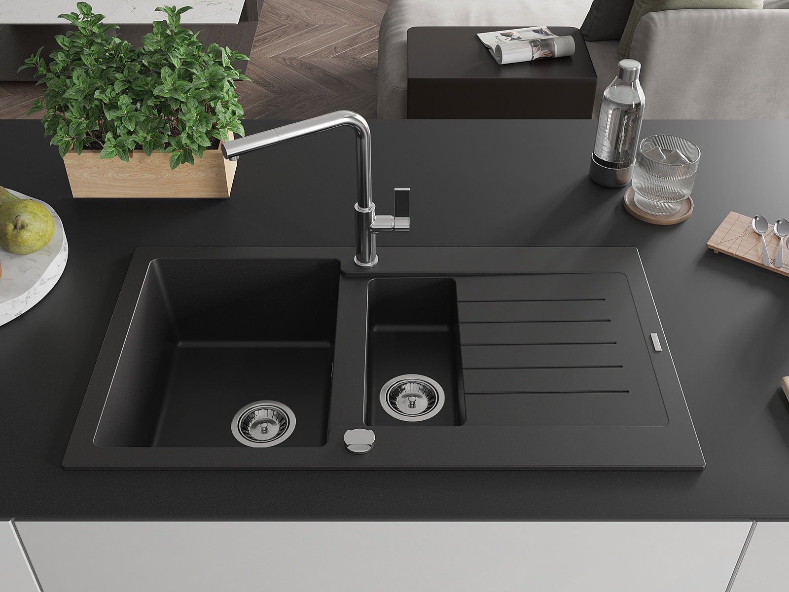 Mexen Matias granitizlietne ar 1,5 kameru, ar noteces un virtuvju jaucējkrānu Flora, melna - 6502-77-670401-00