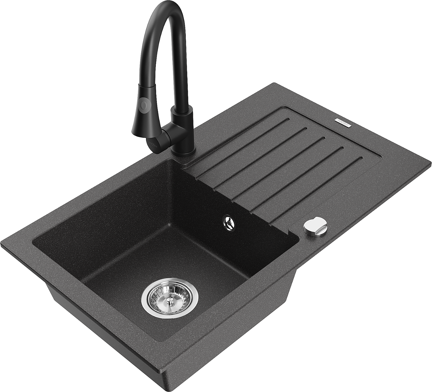 Mexen Pablo granitizlietne izlietne ar vienu nodalījumu, notecinātāju un virtuves jaucējkrānu Elia, melna ar plankumiem