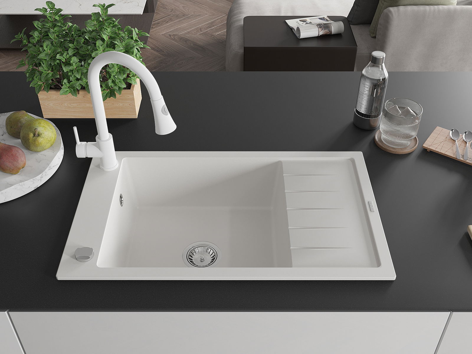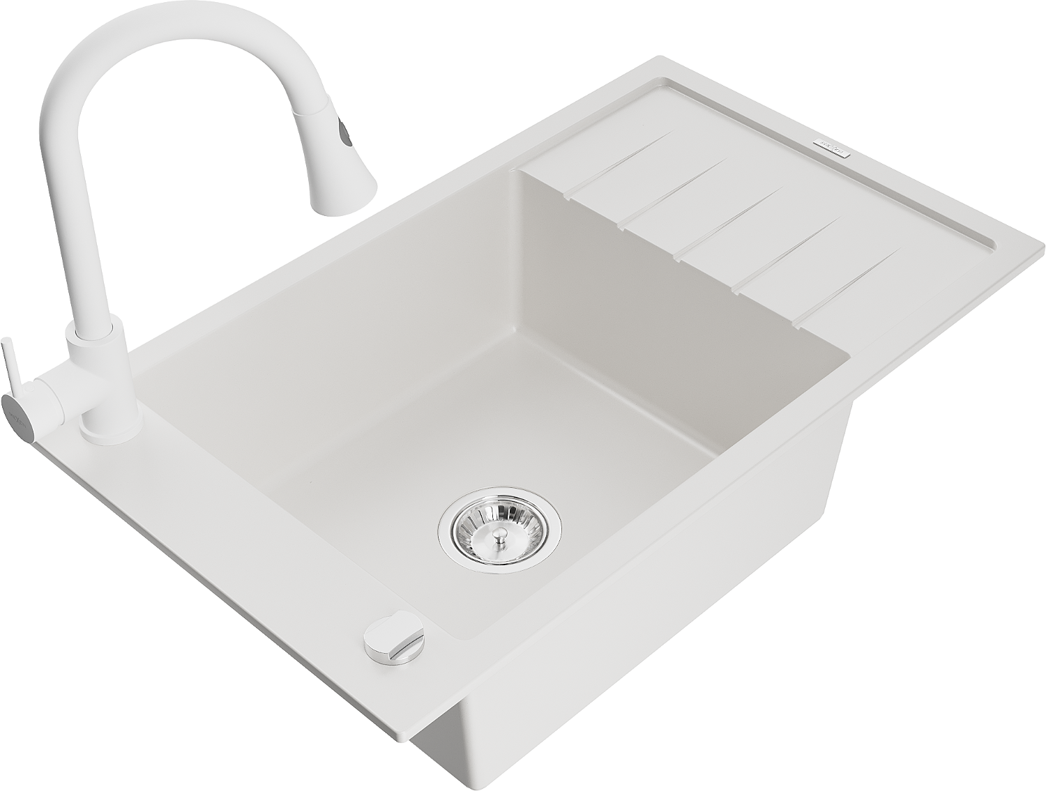 Mexen Elias granit izlietne ar vienu nodalījumu un notecinātāju, ar virtuves jaucējkrānu Elia, balts - 6511-20-670101-20