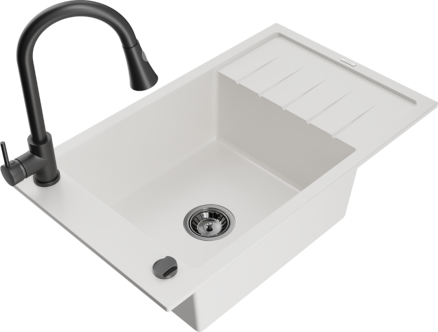 Mexen Elias vienkameras granīta izlietne ar noteku un virtuves jaucējkrānu Elia, balts - 6511-20-670101-70