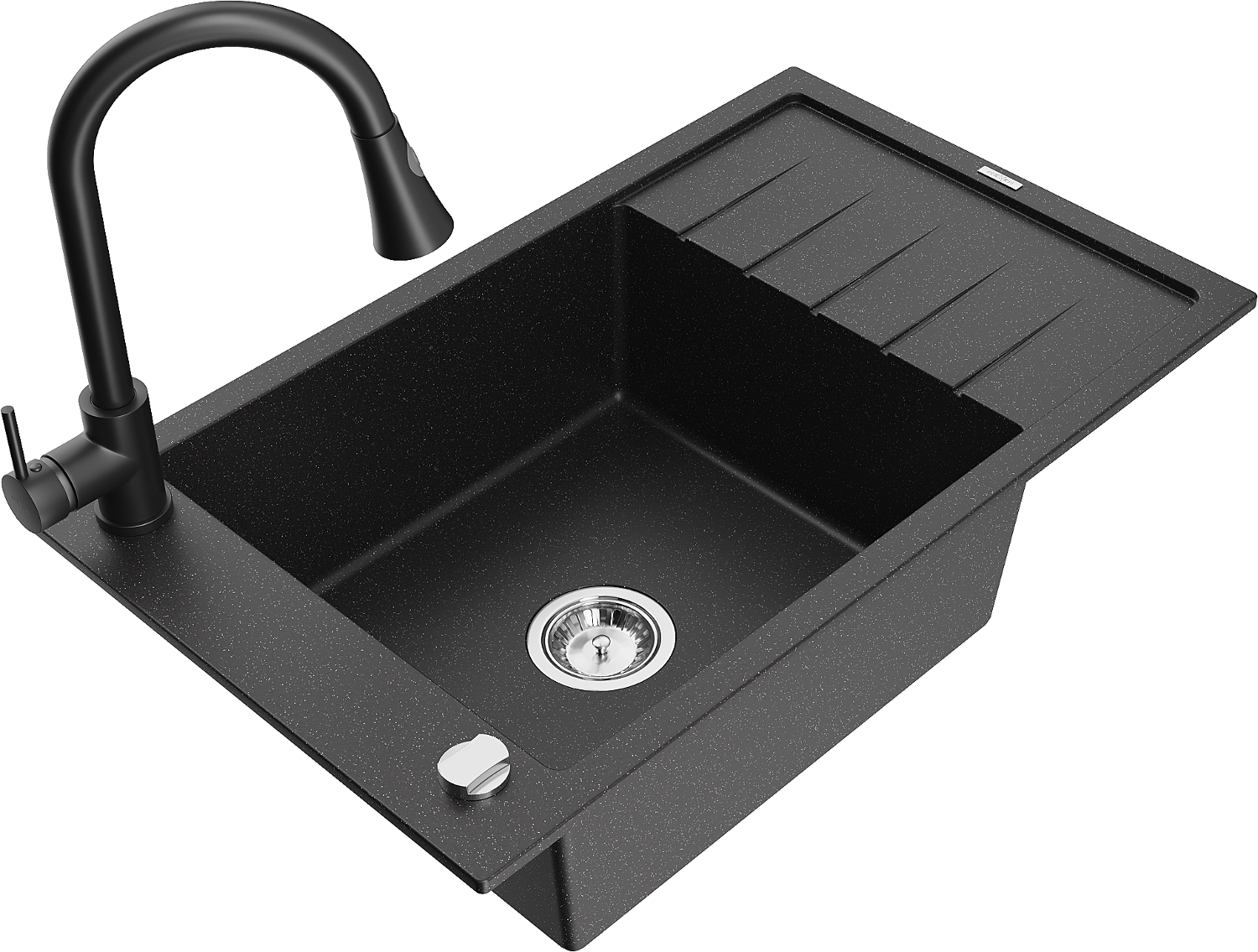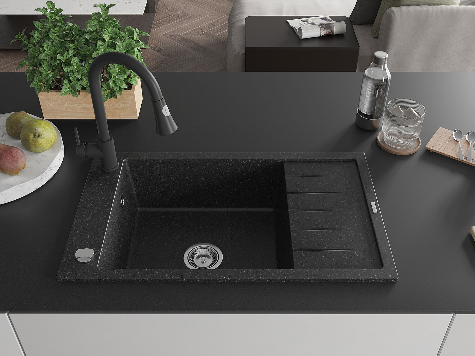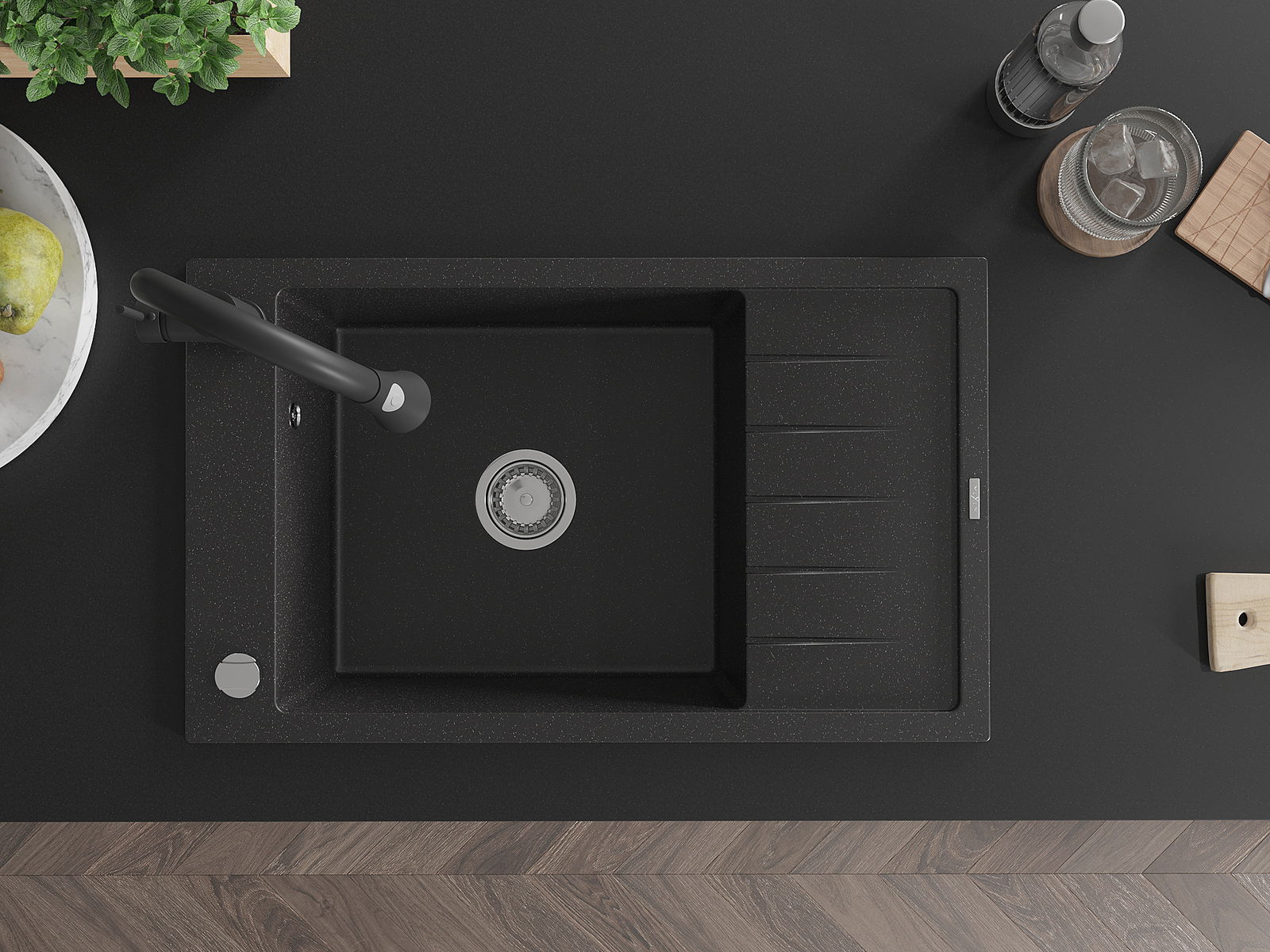 Mexen Elias grānīta izlietne ar 1 nodalījumu, noteci un virtuves jaucējkrānu Elia, melns/sudraba metāliks - 6511-73-670101-70