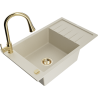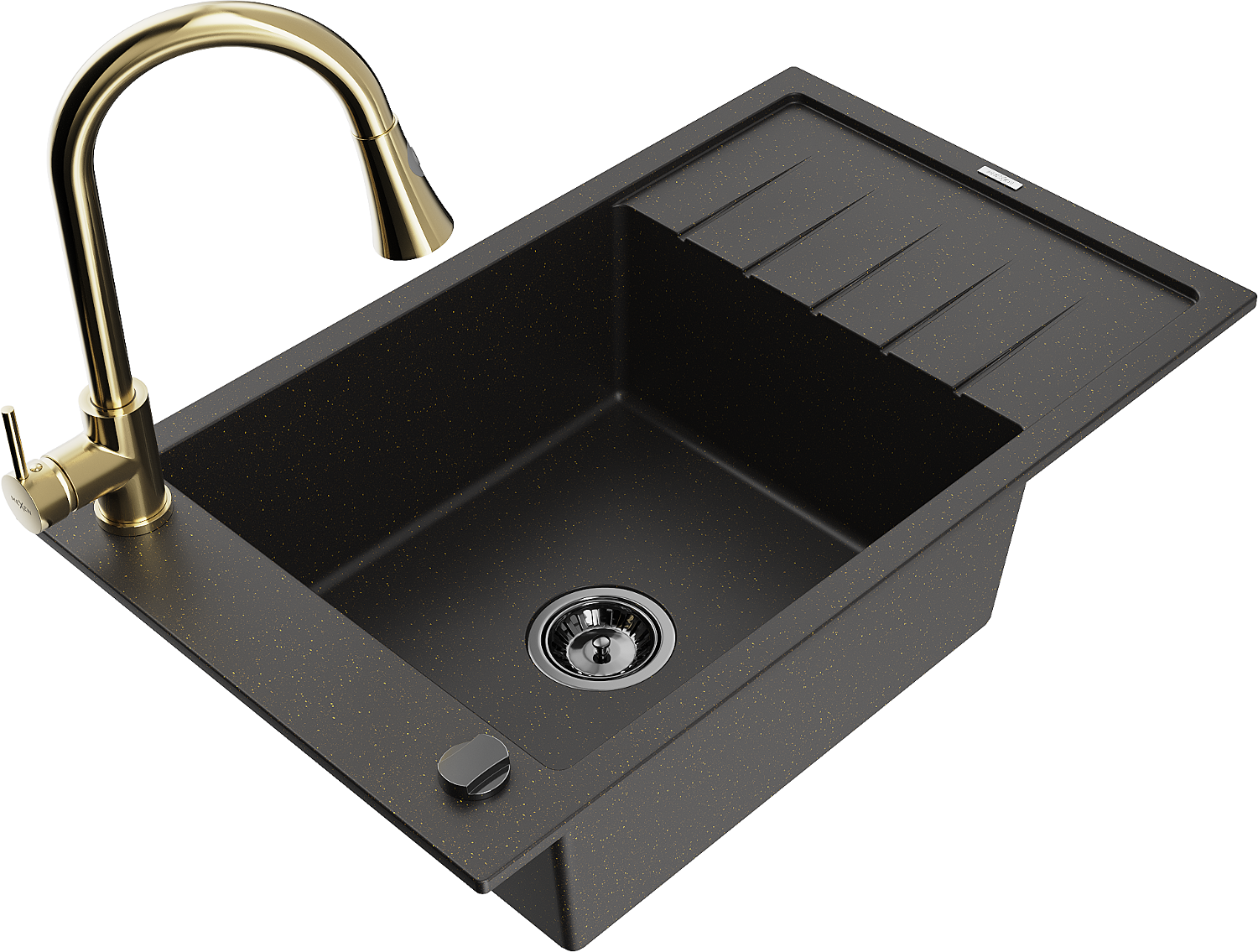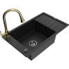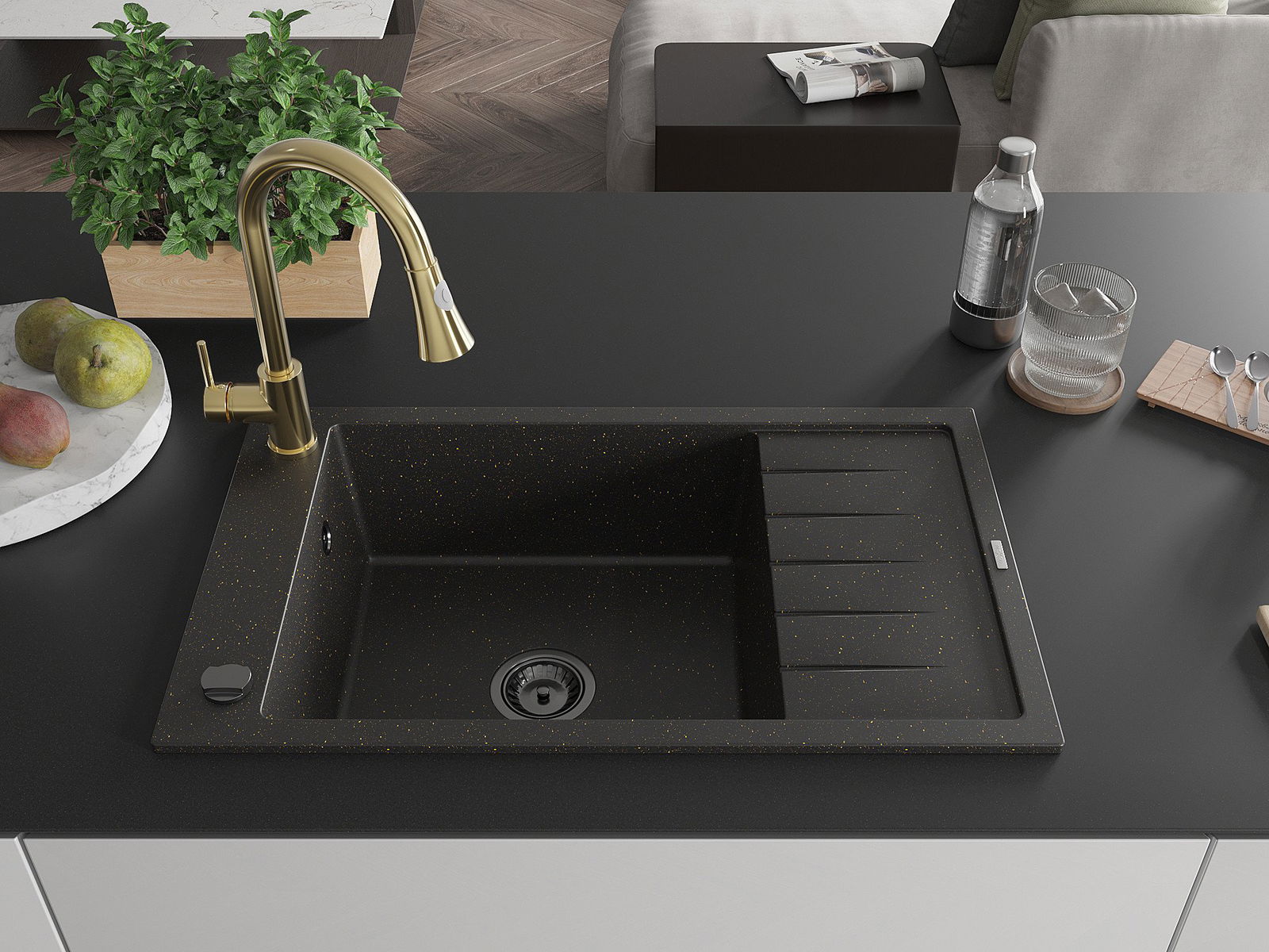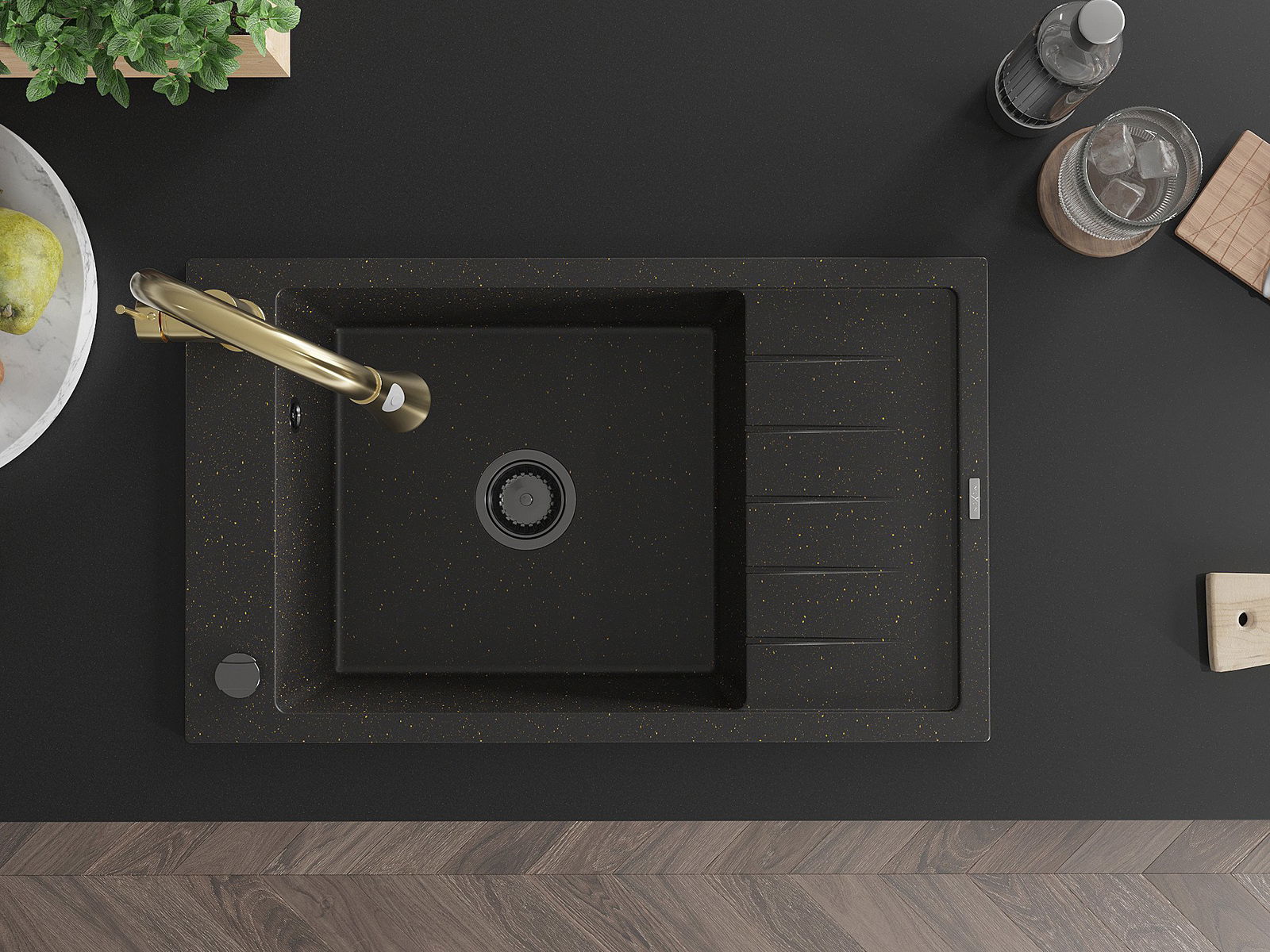 Mexen Elias granitā izlietne ar vienu kameru, noteku un virtuves jaucējkrānu Elia, melns/zelts metallics