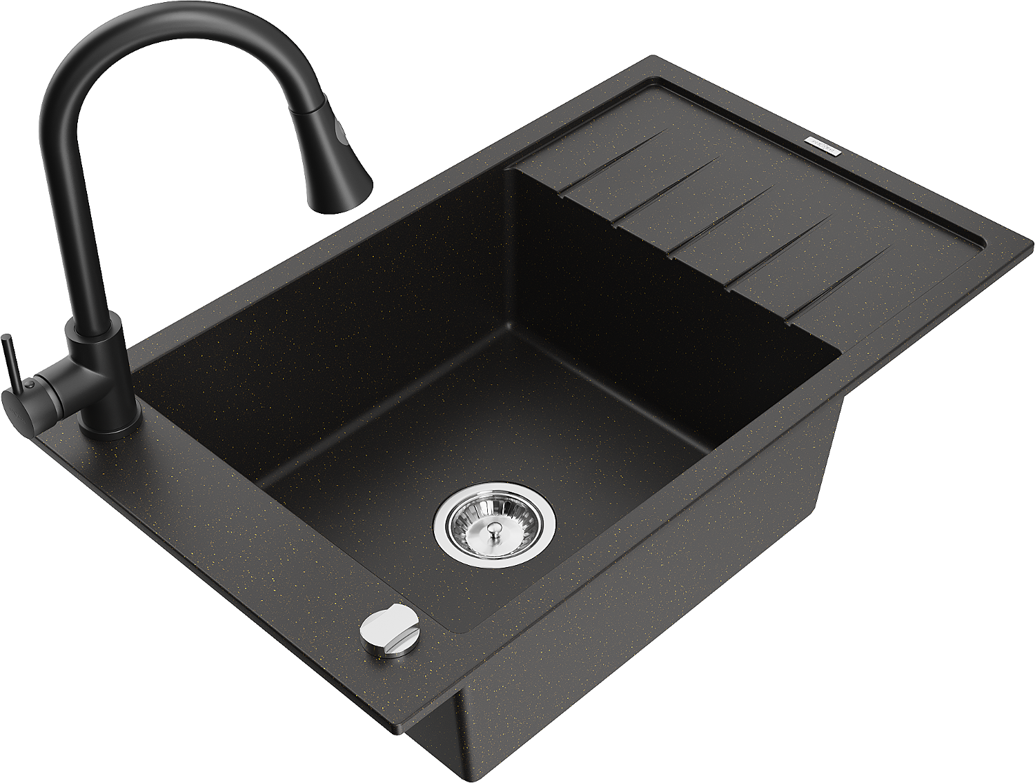 Mexen Elias granitizlietne ar vienu nodalījumu un notekplāksni, ar virtuves krānu Elia, melns/zeltains metāliks