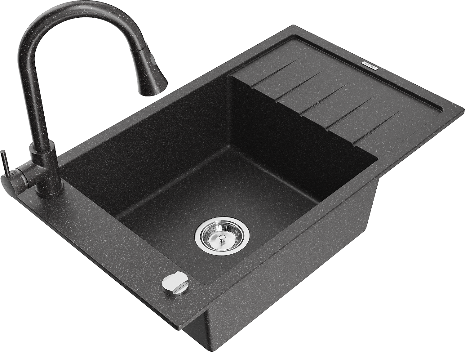 Mexen Elias granīta izlietne ar vienu nodalījumu ar notecējumu un virtuves krānu Elia, melns ar plankumiem