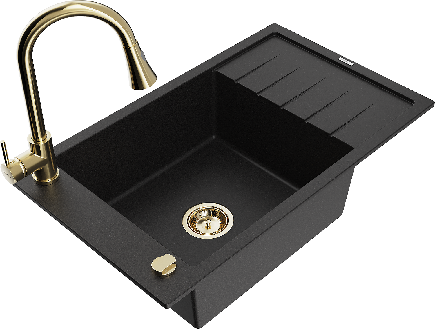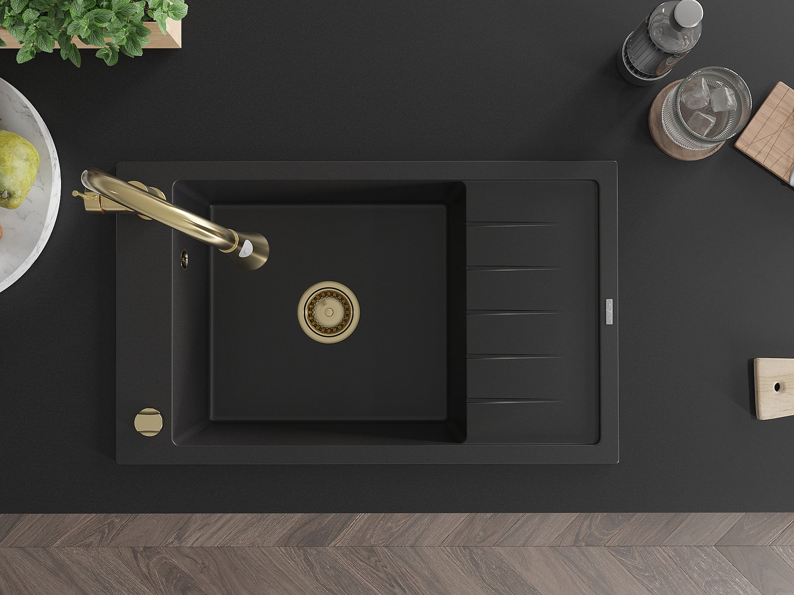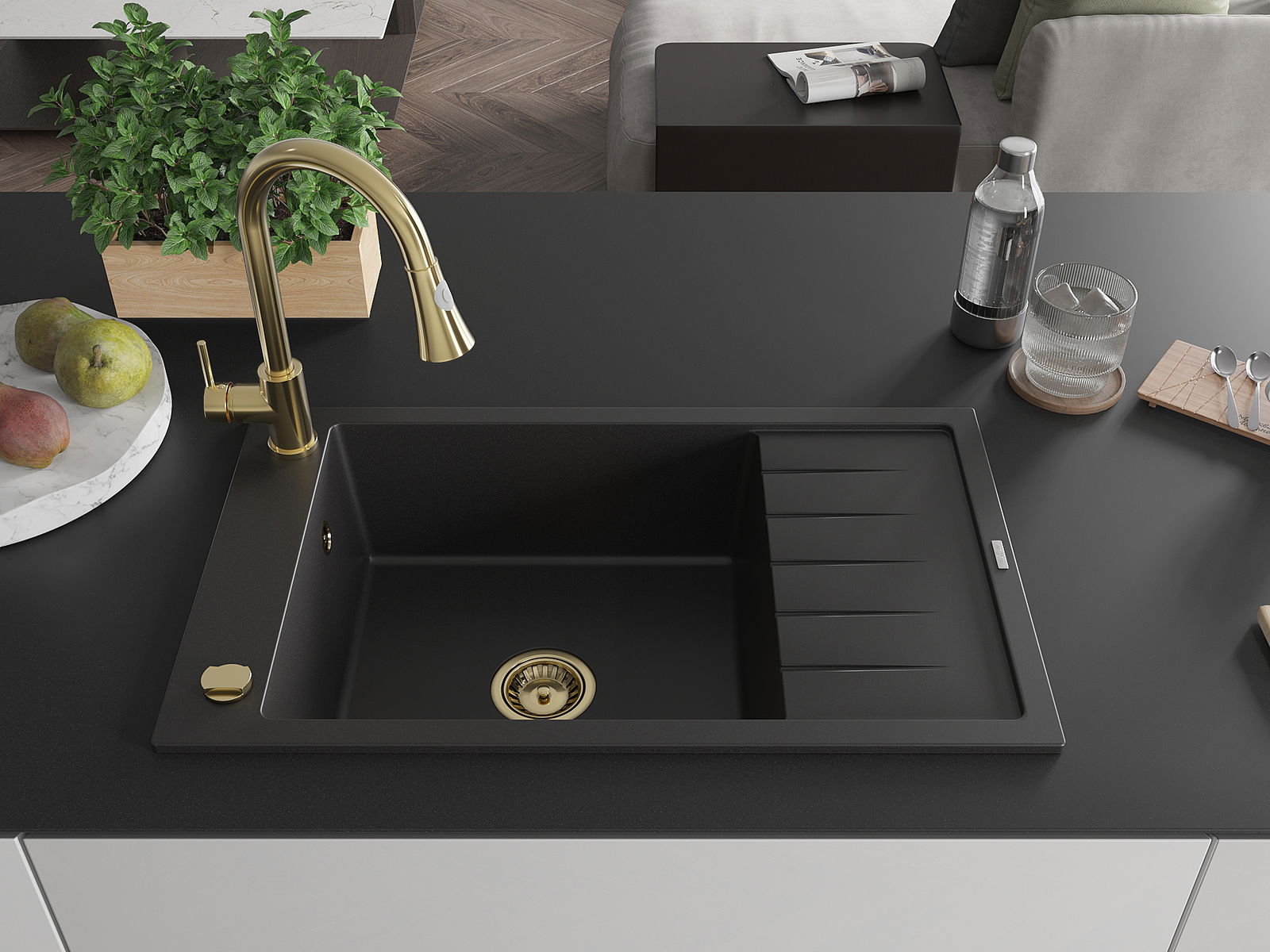 Mexen Elias granīta izlietne ar 1 nodalījumu, noteces un virtuves jaucējkrānu Elia, melna - 6511-77-670101-50