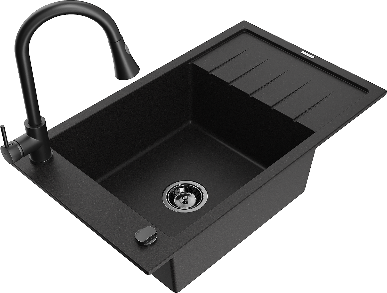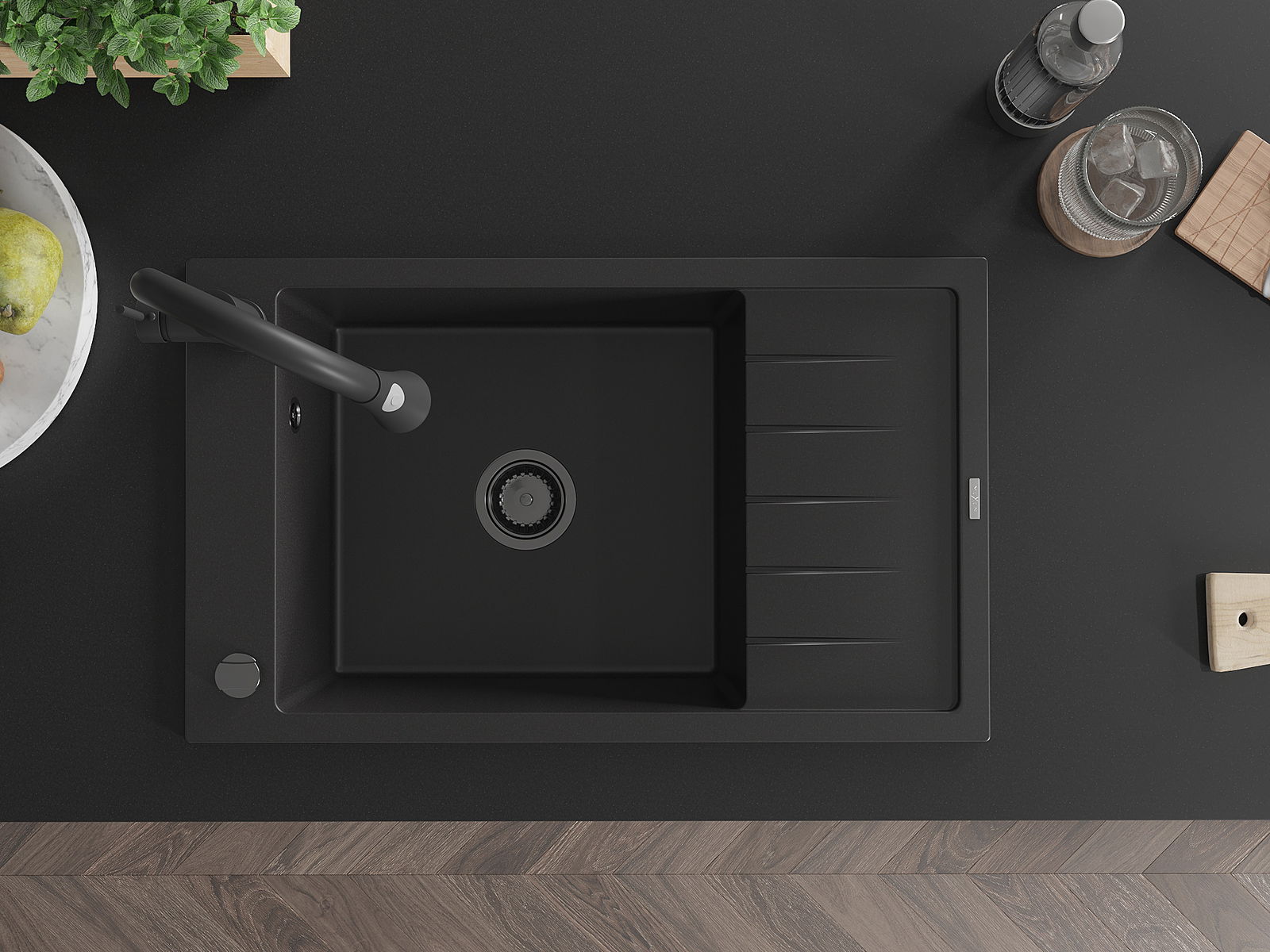 Mexen Elias granitā izlietne ar vienu nodalījumu, noteces un virtuves jaucējkrānu Elia, melna - 6511-77-670101-70-B