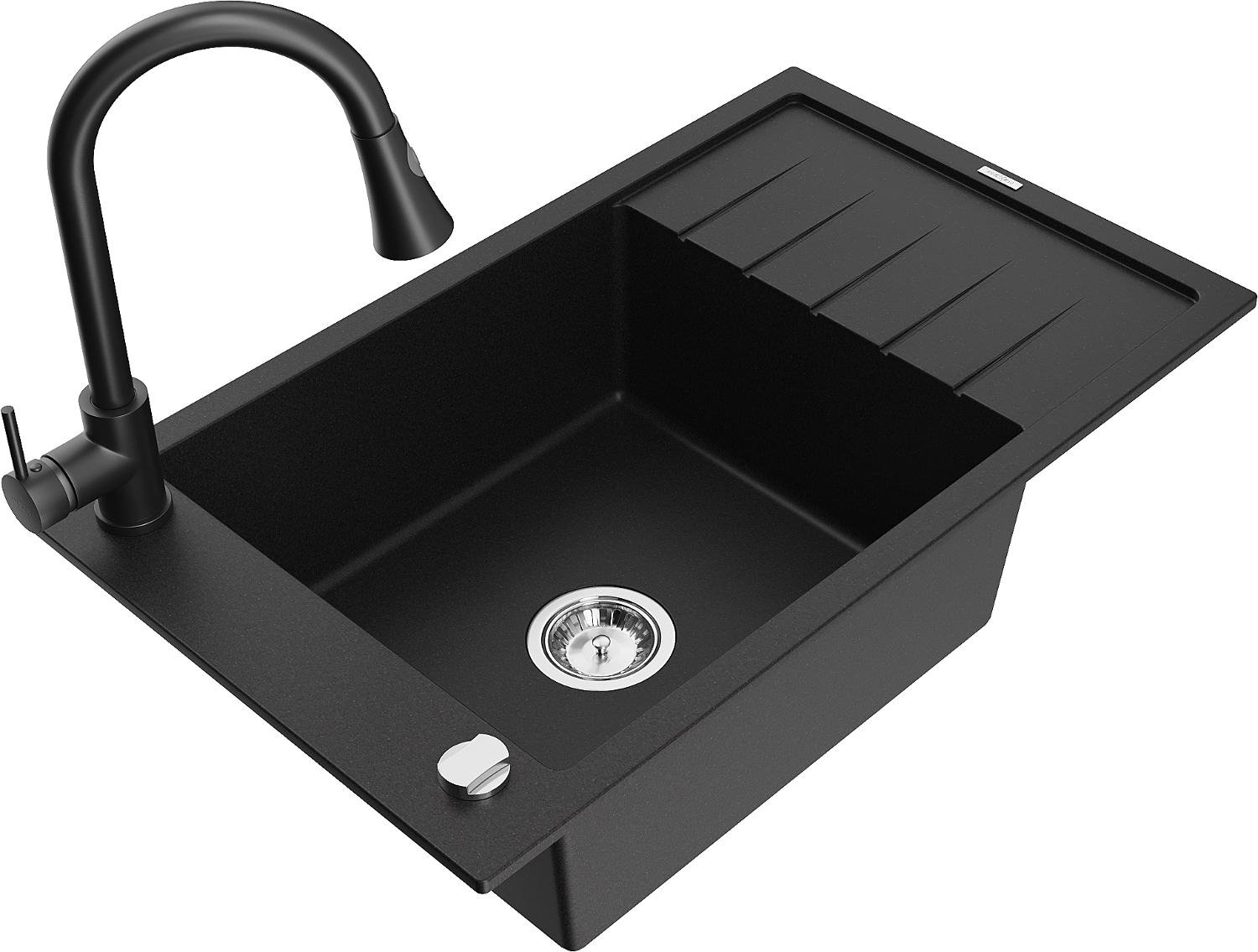 Mexen Elias granitizlietne ar vienu nodalījumu un noteces daļu un virtuves jaucējkrānu Elia, melna - 6511-77-670101-70