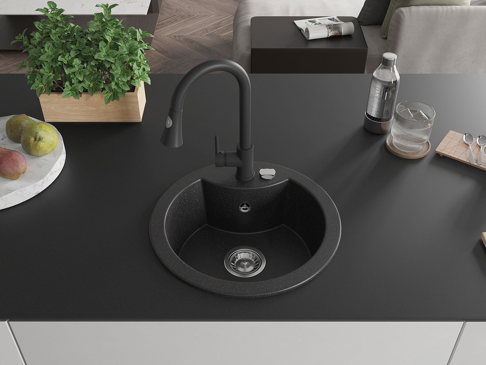 Mexen Diego granitizlietne ar vienu nodalījumu un virtuves krānu Elia, melns/sudraba metāliks - 6512-73-670101-70