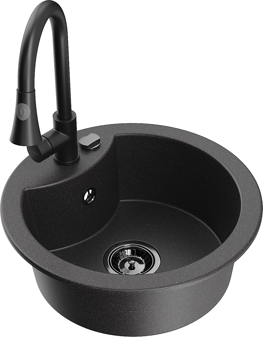 Mexen Diego granitē izlietne ar vienu bļodu un virtuves jaucājkrānu Elia, melns ar ieslakām - 6512-76-670101-70-B