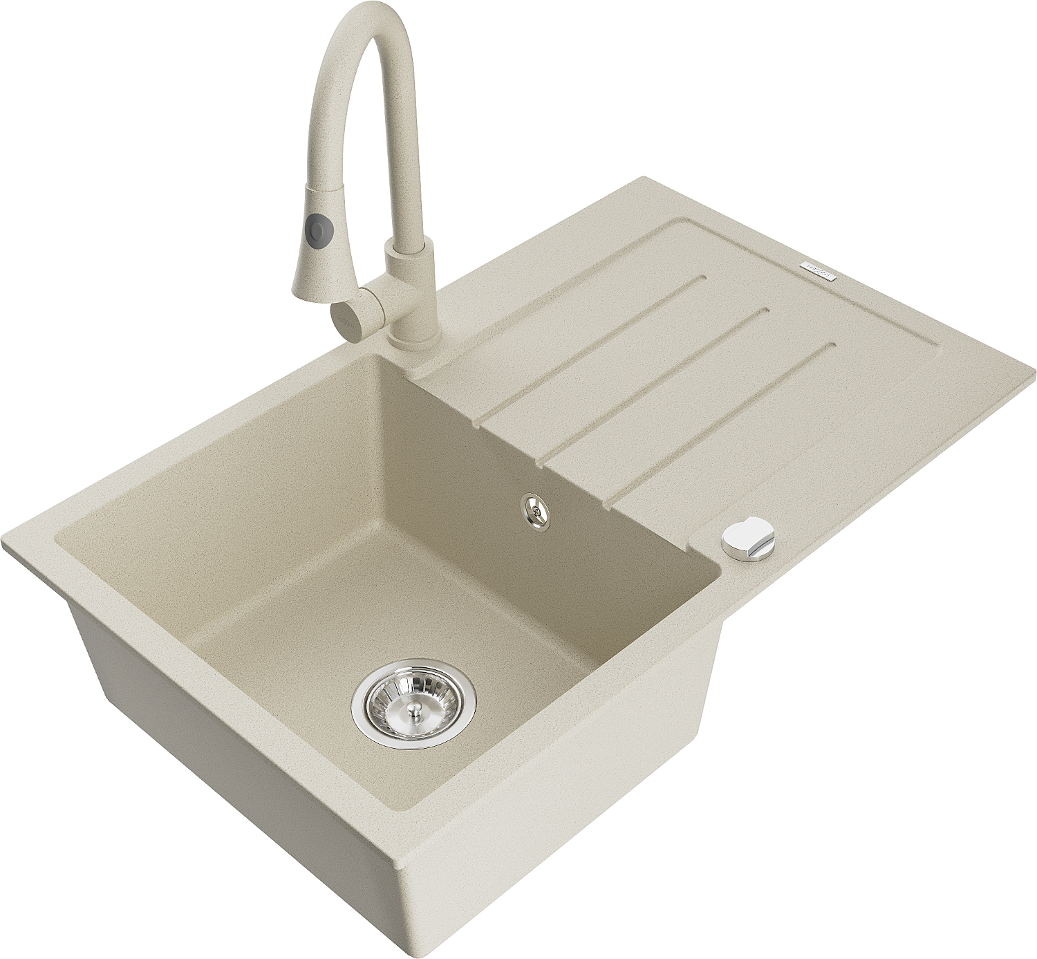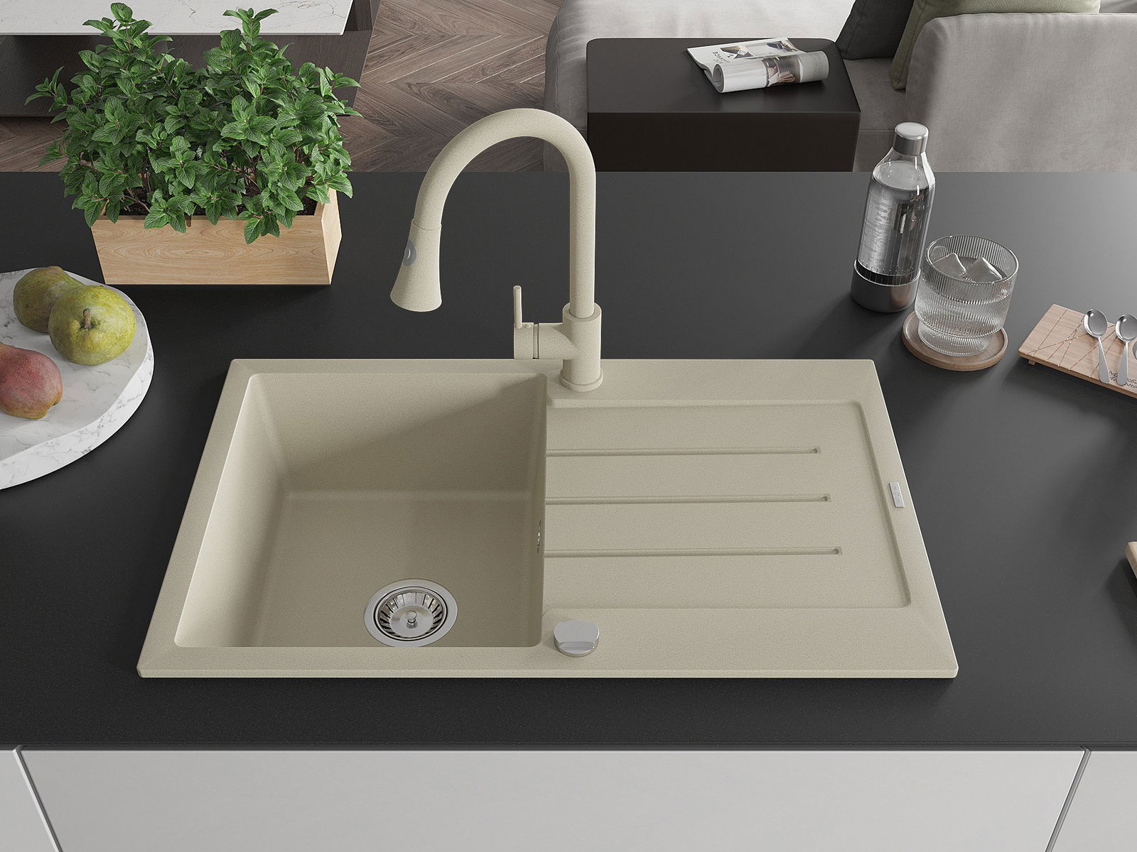 Mexen Bruno granitē izlietne ar vienu nodalījumu ar tekošo daļu un virtuves jaucējkrānu Elia, bēša - 6513-69-670101-69