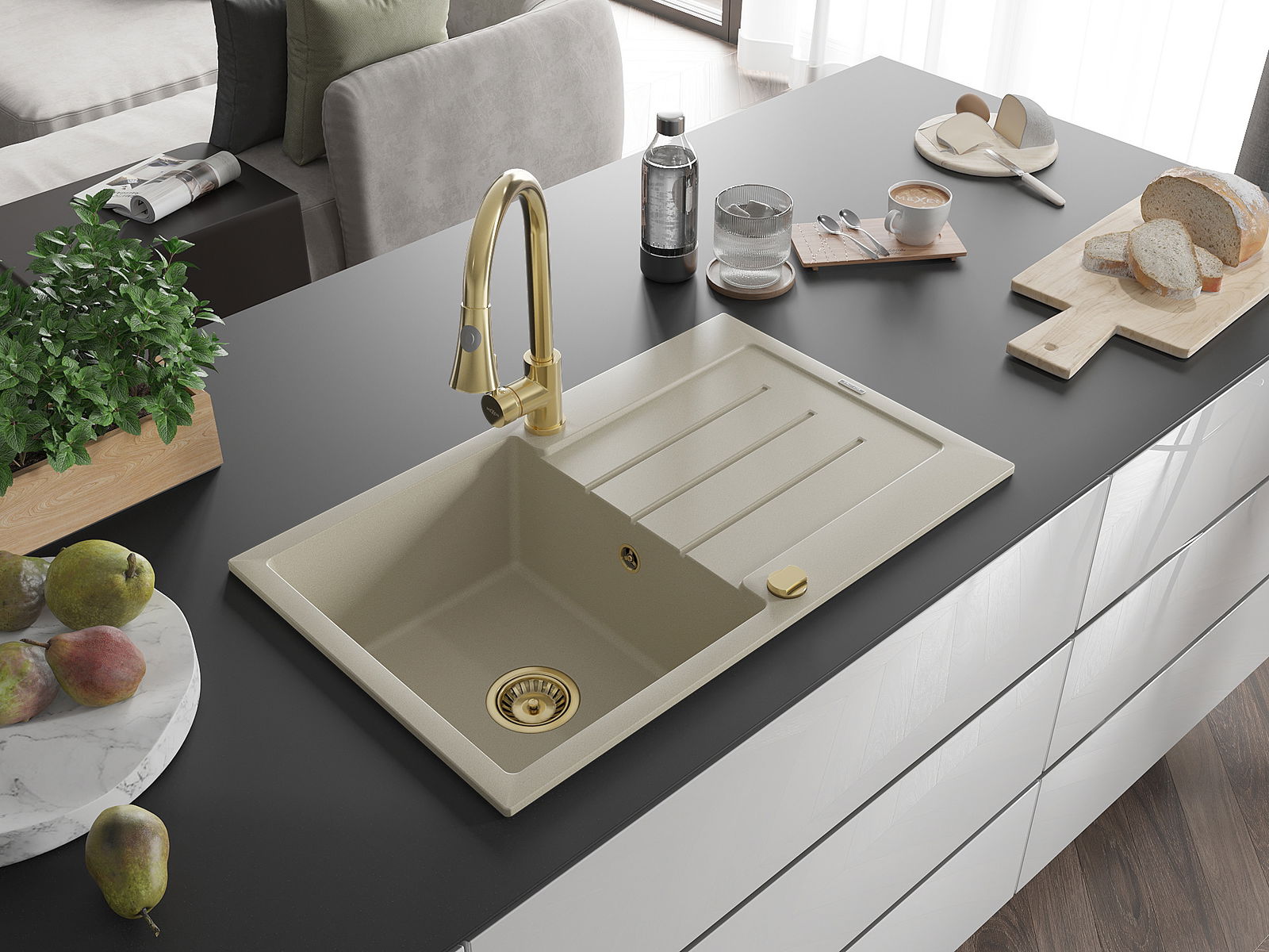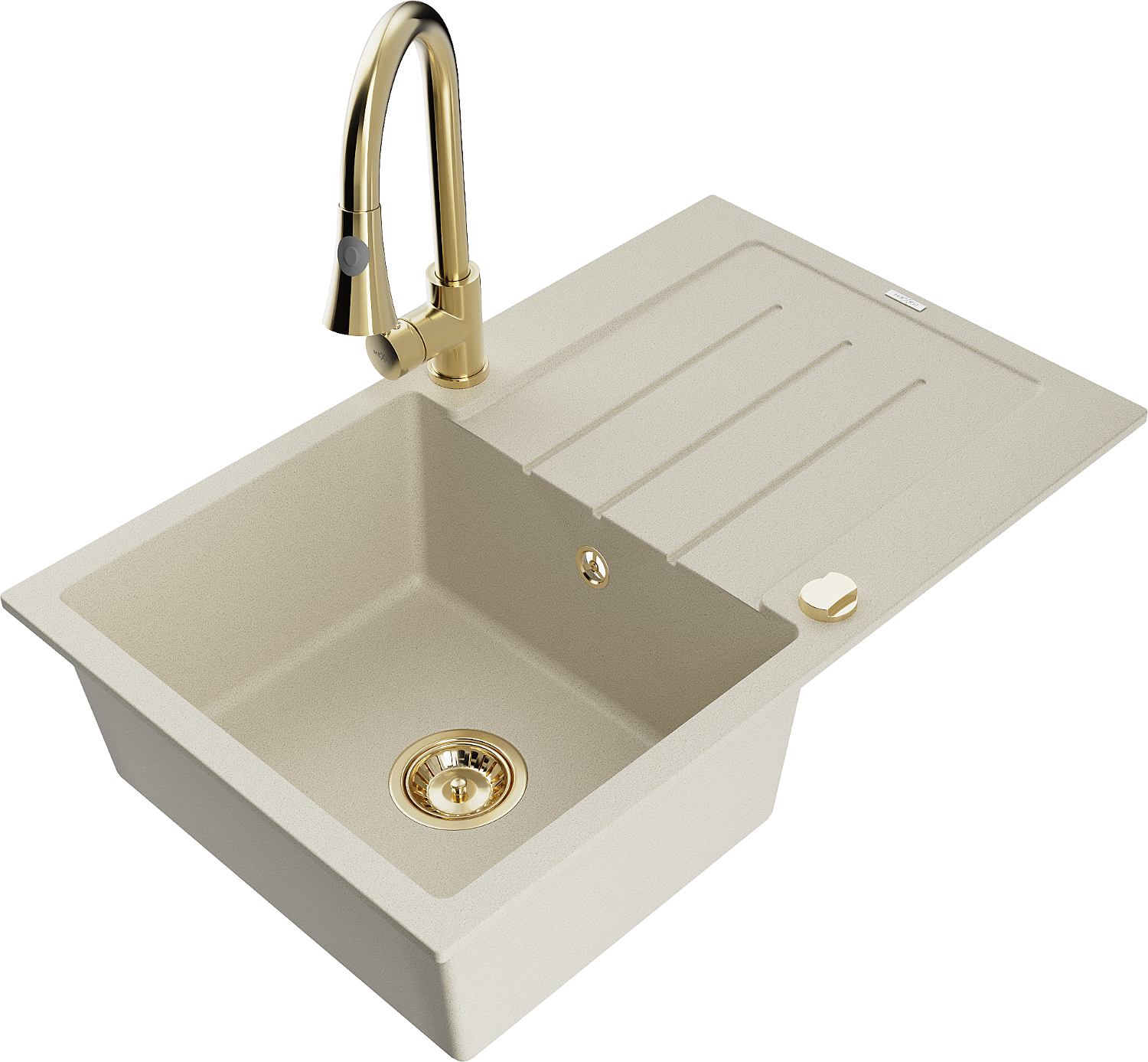 Mexen Bruno granitais izlietne ar vienu nodalījumu ar notecēšanas vietu un virtuves jaucējkrānu Elia, bēša - 6513-69-670101-50