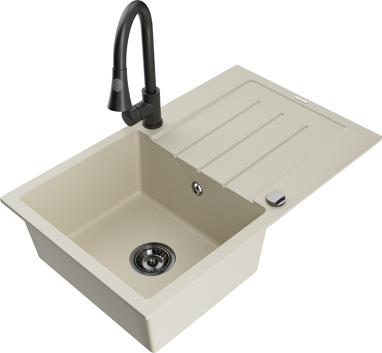 Mexen Bruno granitē izlietne ar vienu nodalījumu un noteces paneli un virtuves jaucējkrānu Elia, bēšs - 6513-69-670101-70