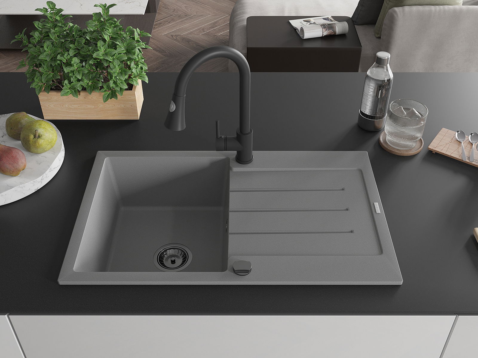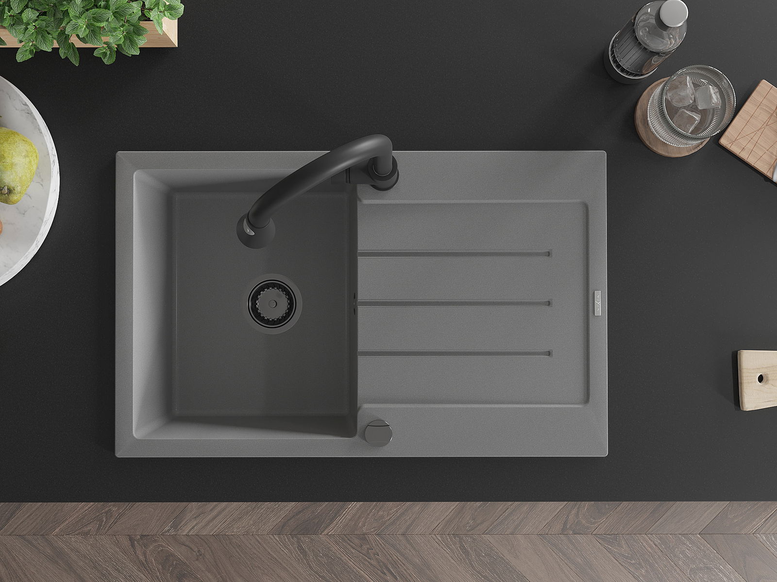 Mexen Bruno viena nodalījuma granīta izlietne ar noteces dēli un virtuves jaucējkrānu Elia, pelēka - 6513-71-670101-70-B