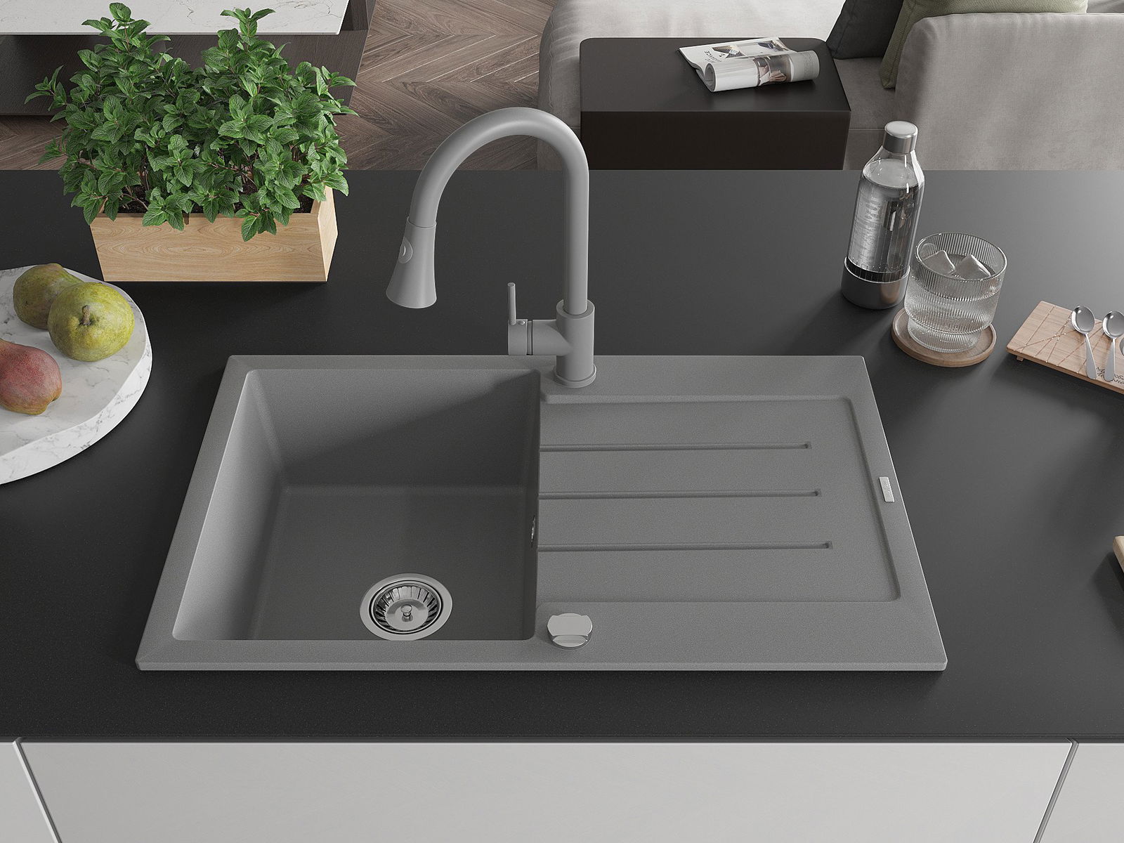 Mexen Bruno 1-kameru granīta izlietne ar notecinātāju un virtuves jaucējkrānu Elia, pelēka - 6513-71-670101-71