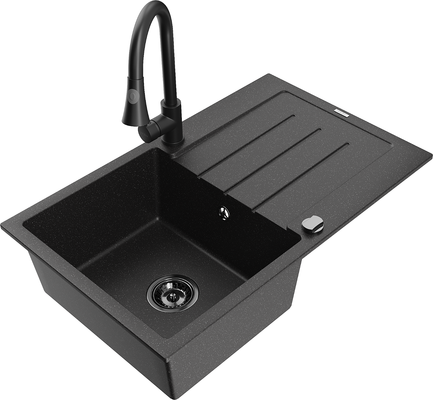 Mexen Bruno granitizlietne 1-kamerne ar notekam un virtuves jaucējkrānu Elia, melns/sudraba metāliks - 6513-73-670101-70-B