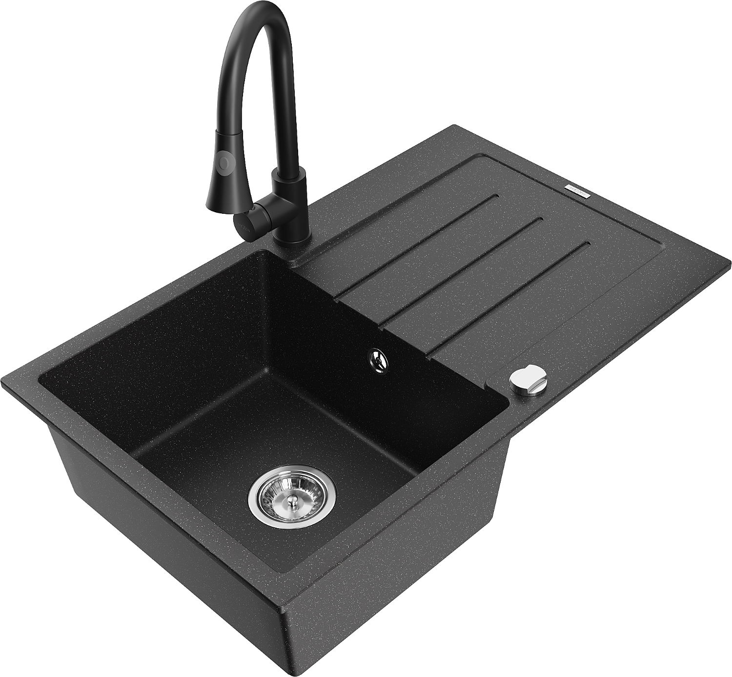 Mexen Bruno granitizlietne 1-kameras izlietne ar noteku un Elia virtuves jaucējkrānu, melns/sudraba metālisks