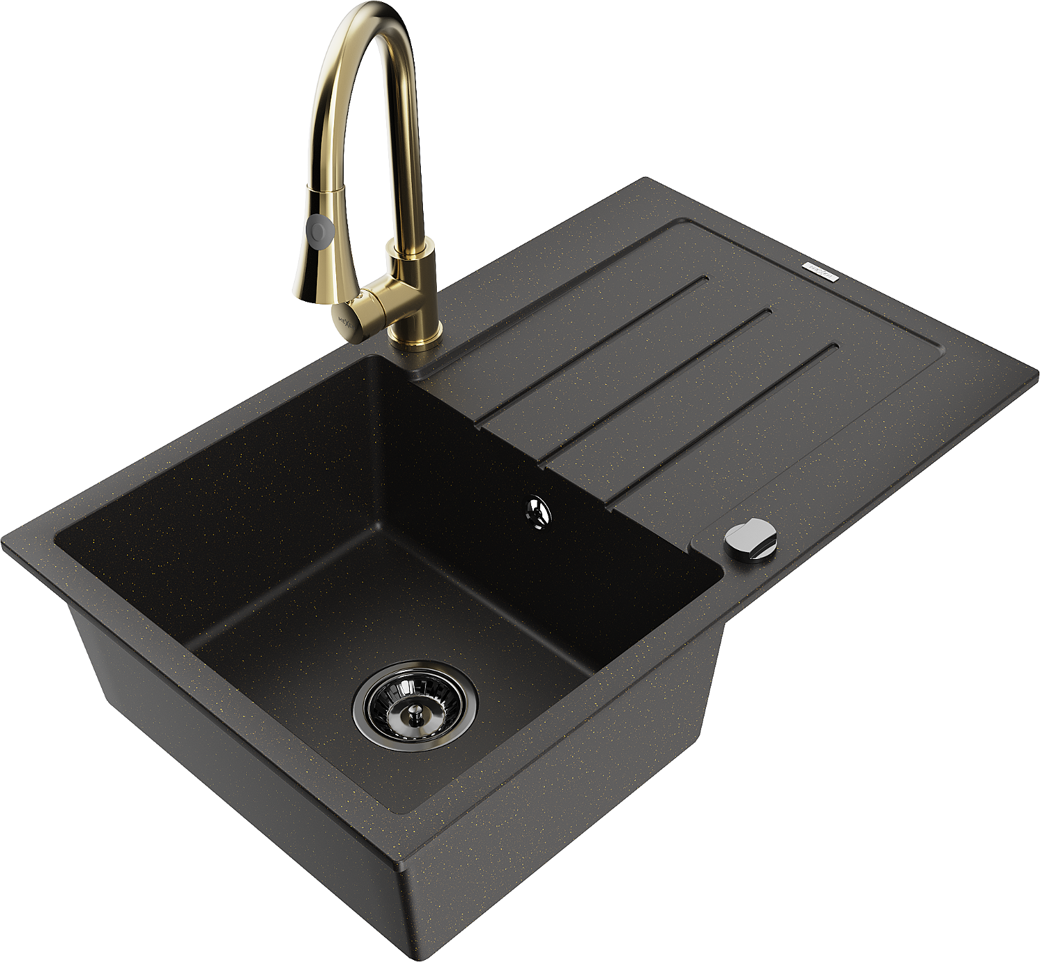 Mexen Bruno granitā izlietne ar vienu nodalījumu, noteci un virtuves krānu Elia, melns/zeltīts metālisks - 6513-75-670101-50-B