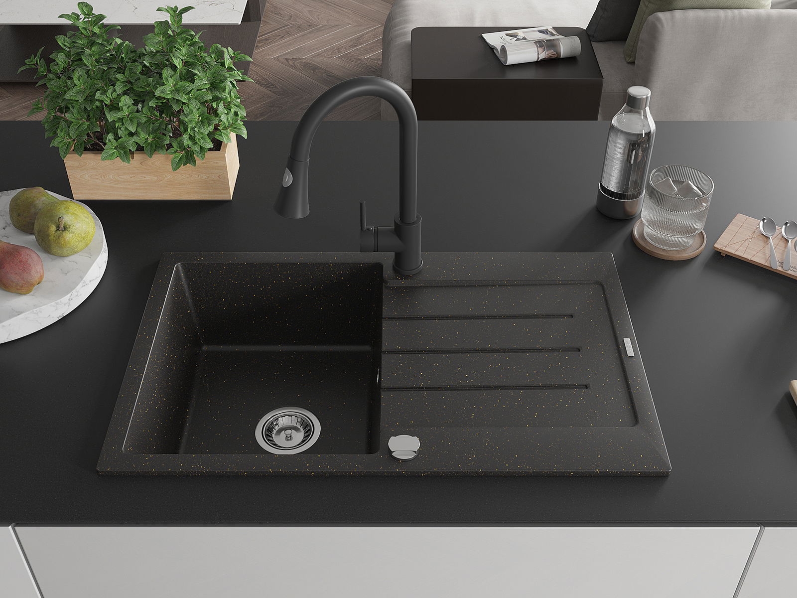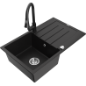 Mexen Bruno 1-kameru granīta izlietne ar noteces zonu un virtuves jaucējkrānu Elia, melna/zeltaina metālika