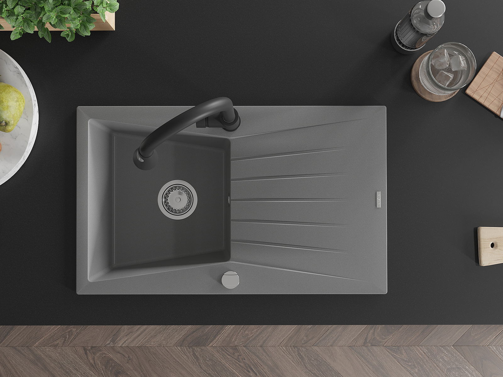 Mexen Cesar granīta izlietne ar vienu nodalījumu, notecināšanas virsmu un virtuves jaucējkrānu Elia, pelēka - 6514-71-670101-70