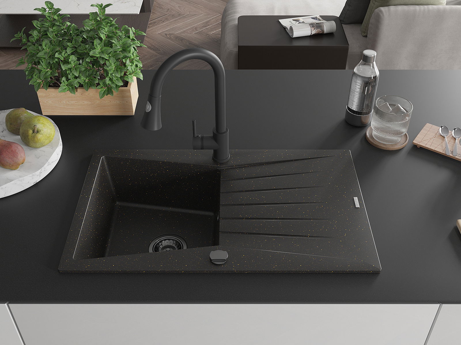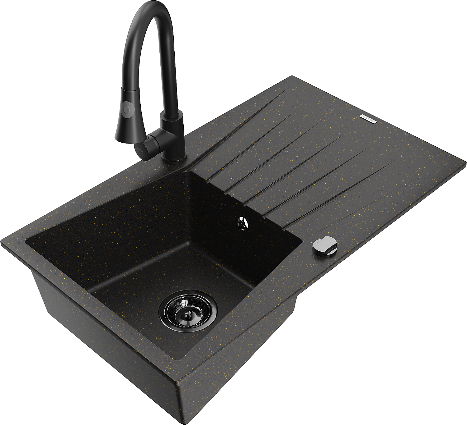 Mexen Cesar vienkameras granīta izlietne ar notecējumu un virtuves jaucējkrānu Elia, melns/zelta metālisks - 6514-75-670101-70-B