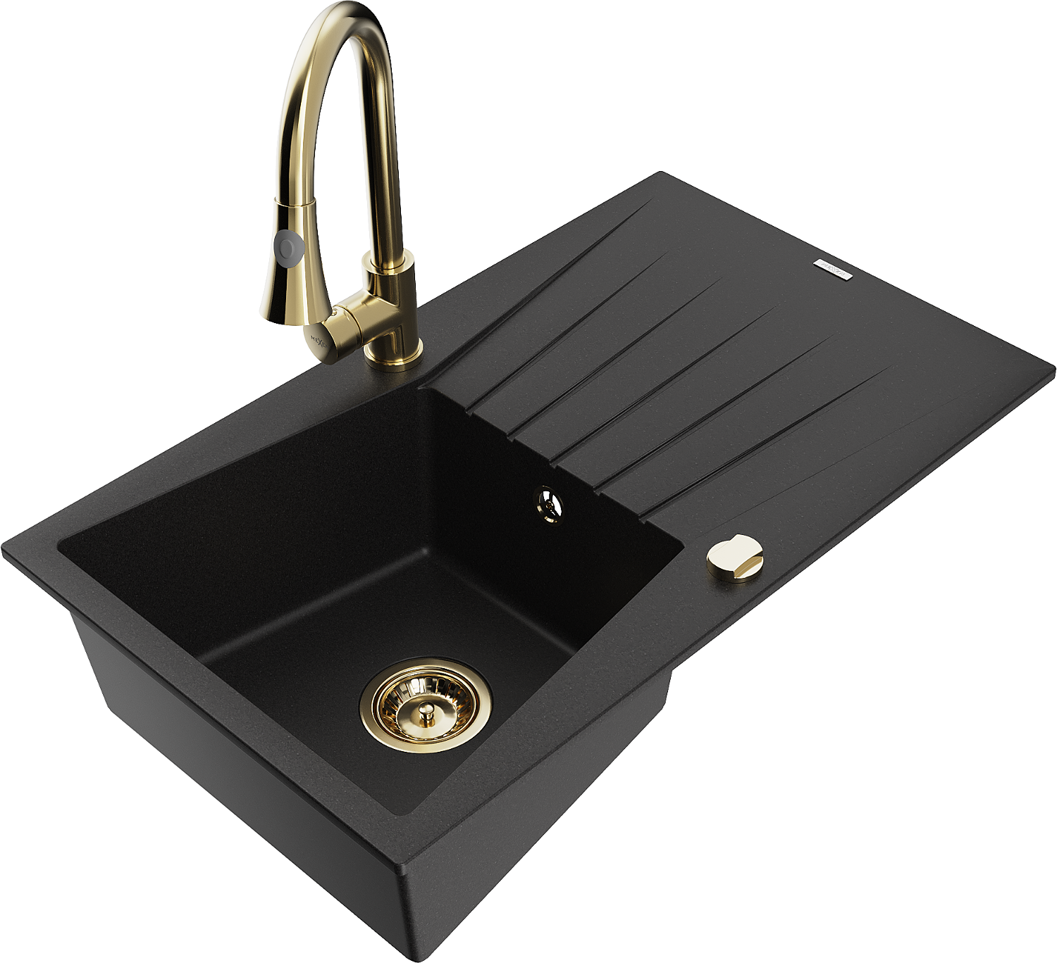 Mexen Cesar granitā izlietne ar 1 nodalījumu, notekpaplāti un virtuves jaucējkrānu Elia, melns - 6514-77-670101-50